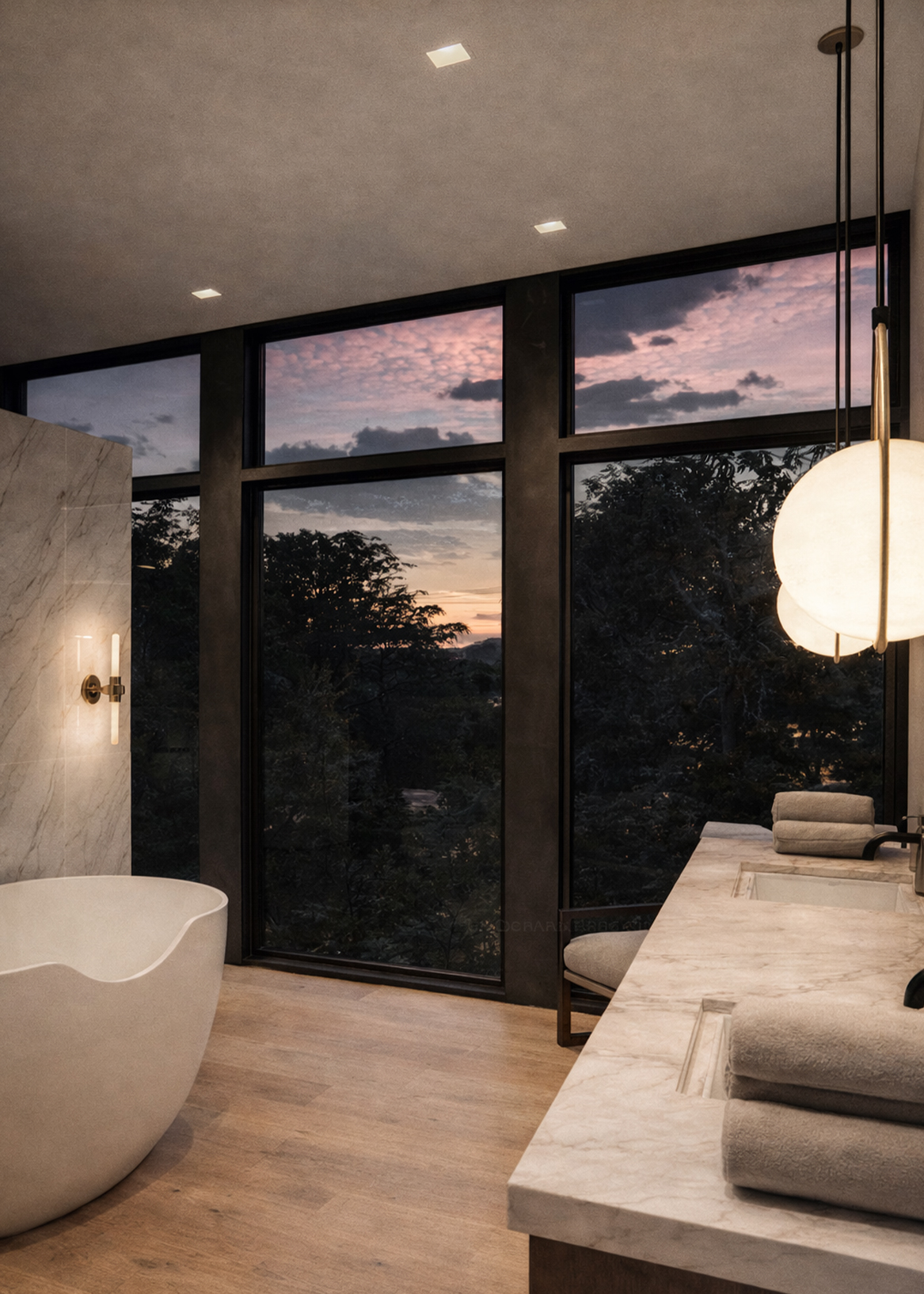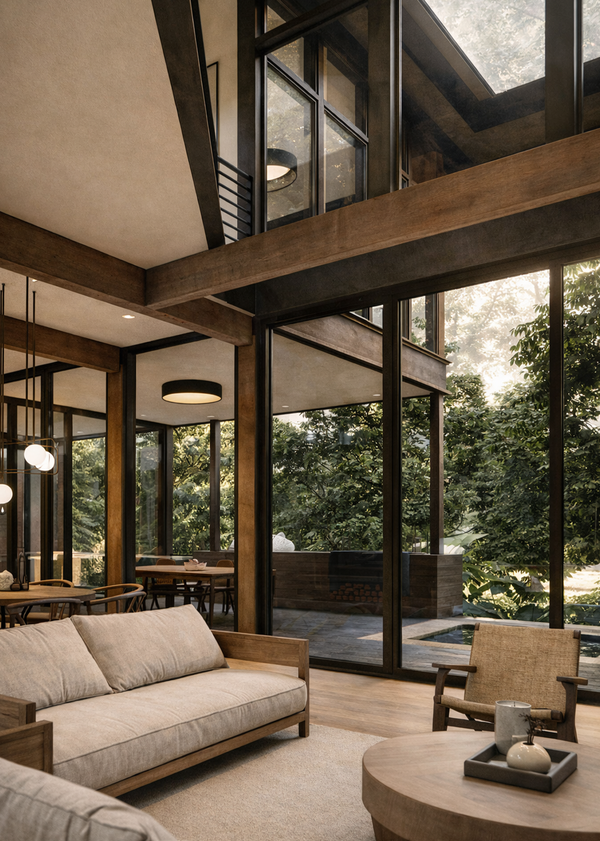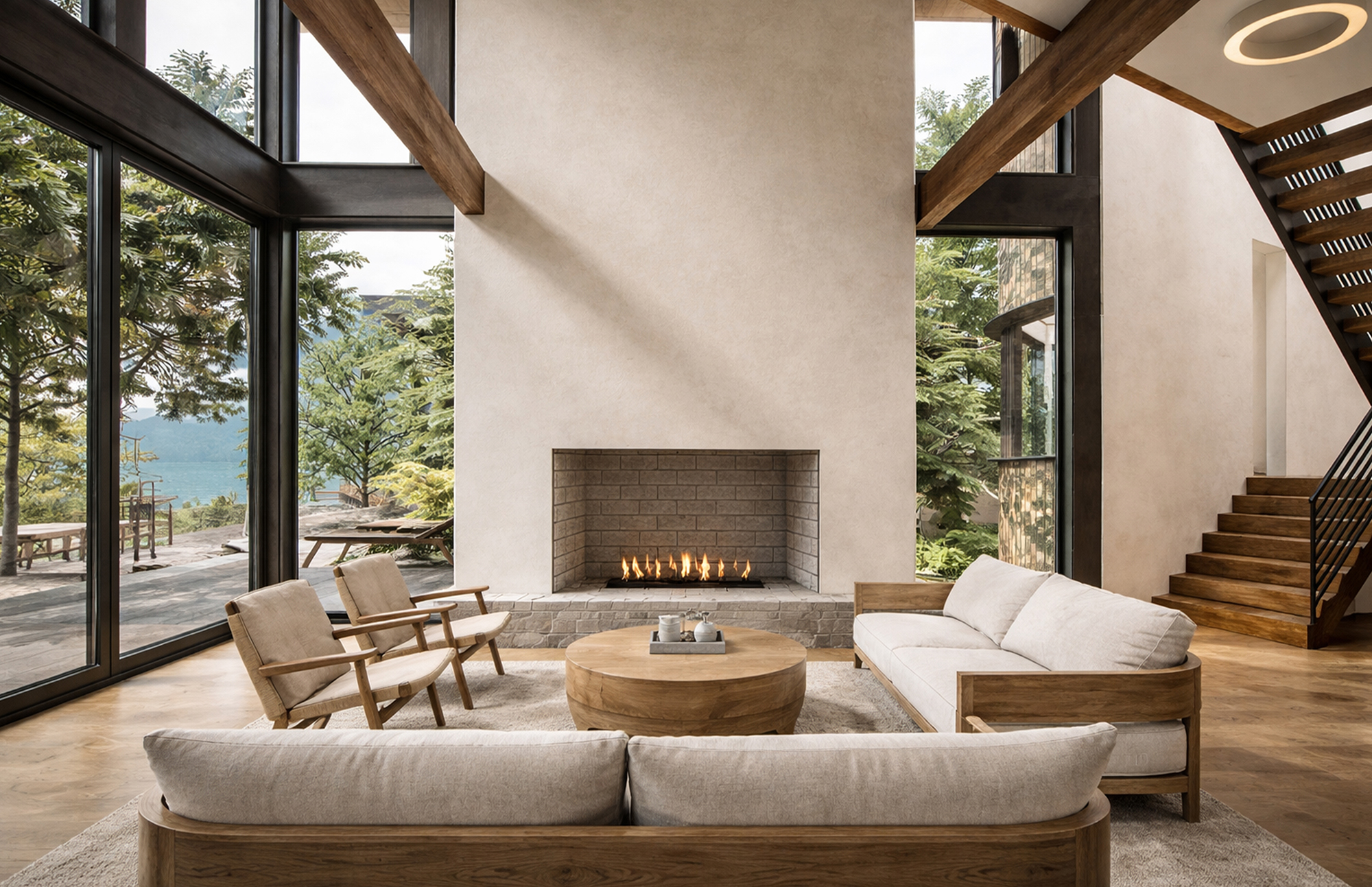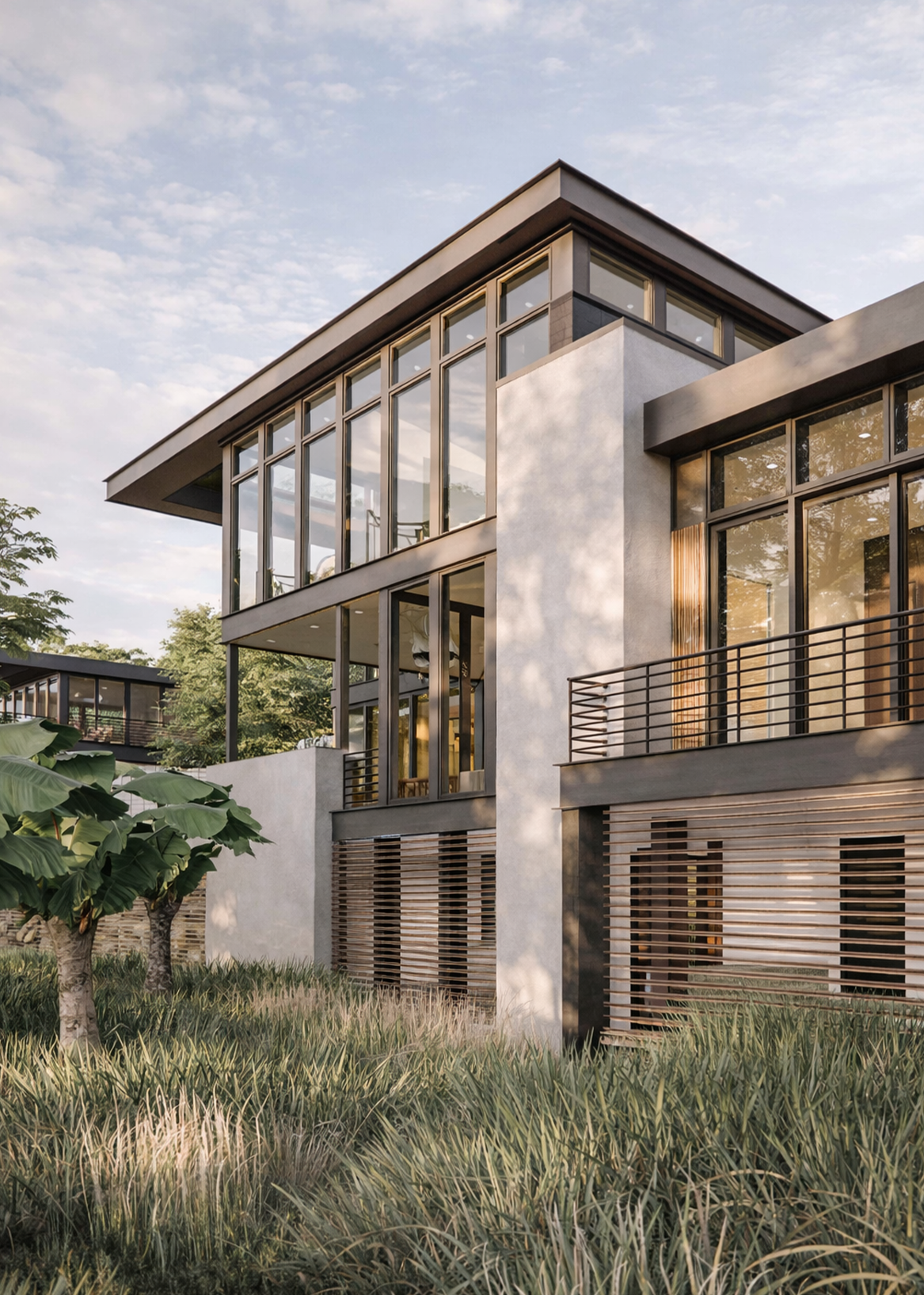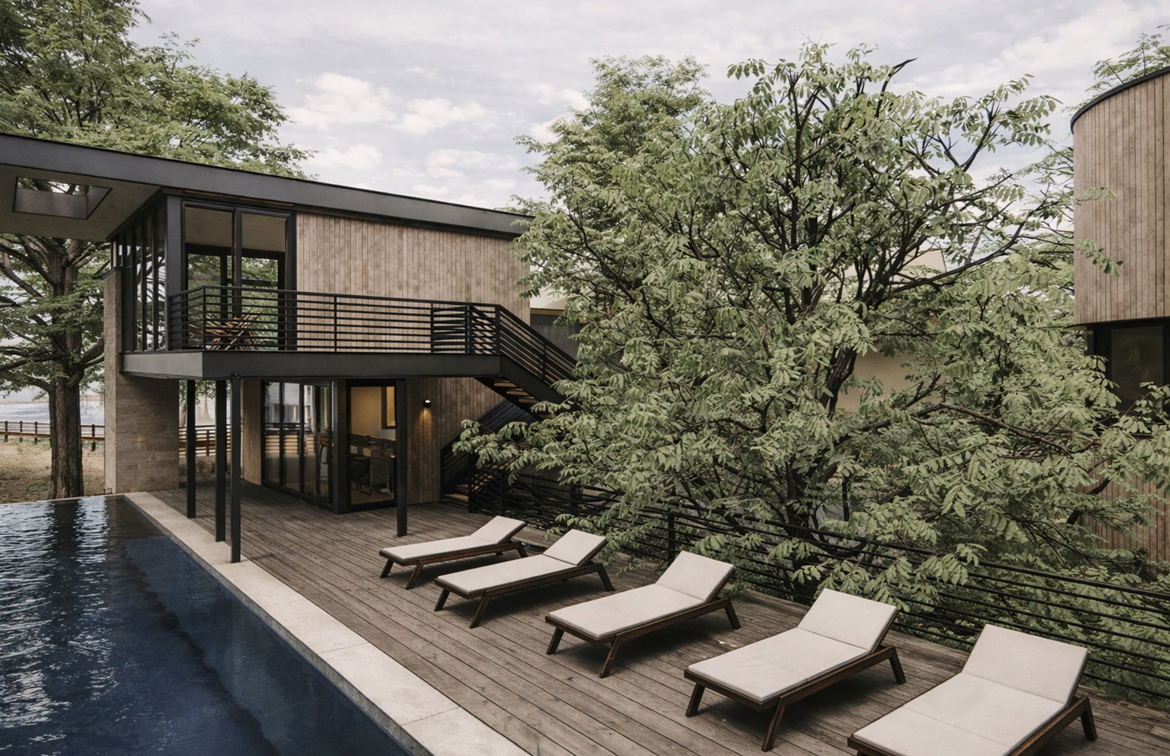 A large pool extends from the house, with trees rising directly from its edge—a gesture that blurs the line between built and natural, garden and water. Throughout, light and shadow shift with the day, animating the interiors and framing views of the horizon.Stone, glass, and timber balance modern clarity with regional charm, grounding the house in the textures of its coastal setting. Both sanctuary and gathering place, the residence reflects the calm of the bay while expressing a refined Southern spirit.