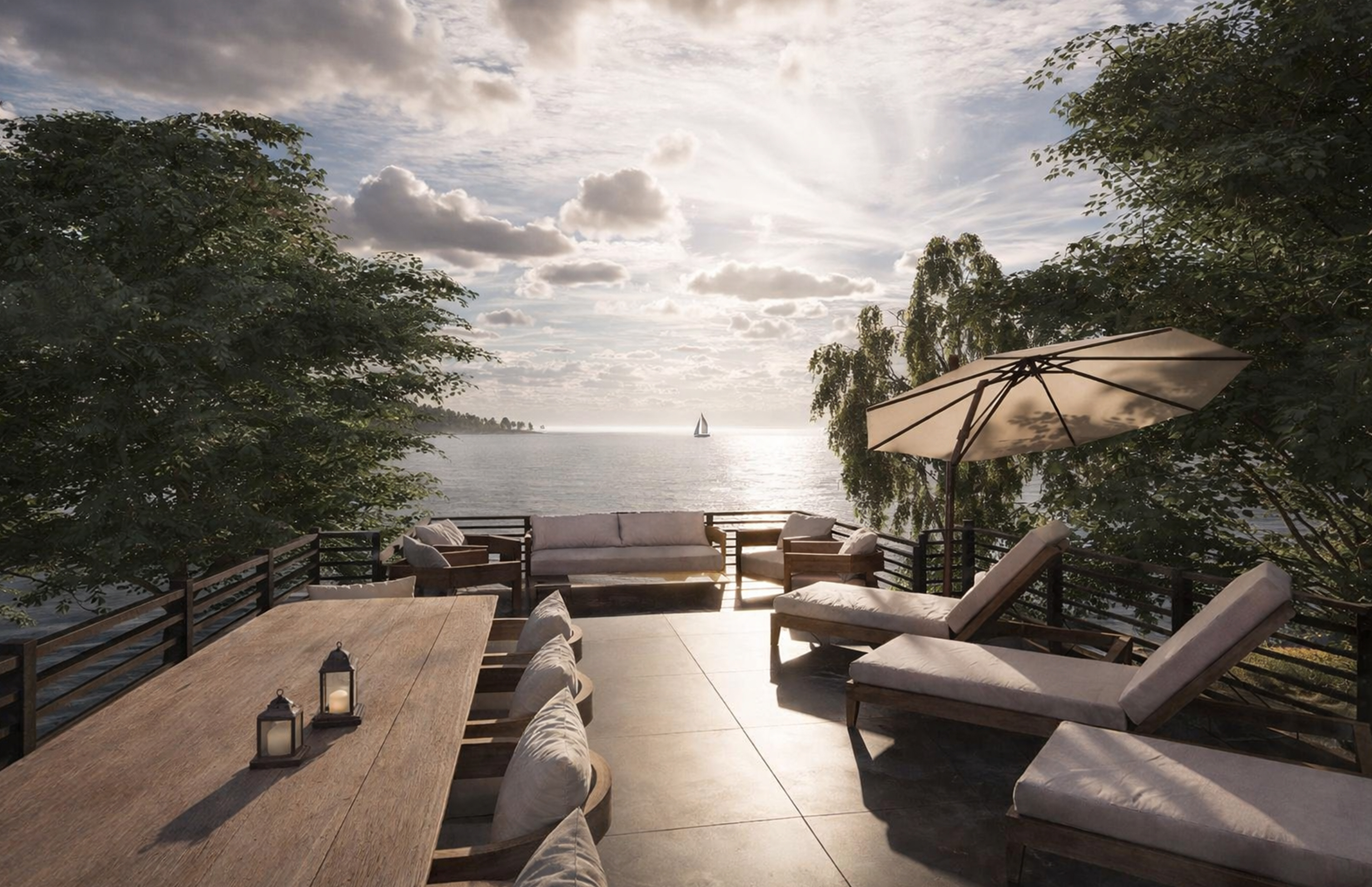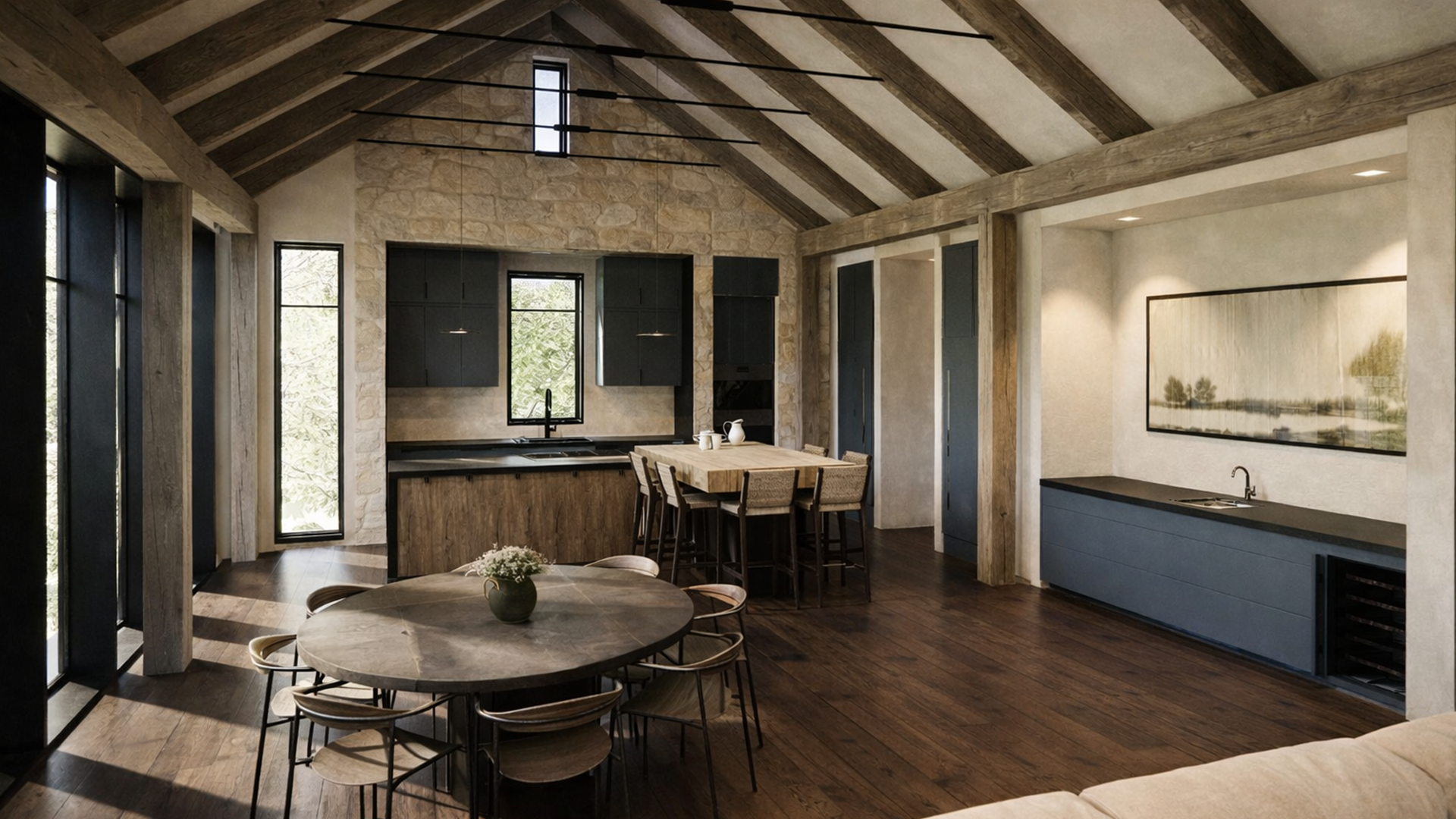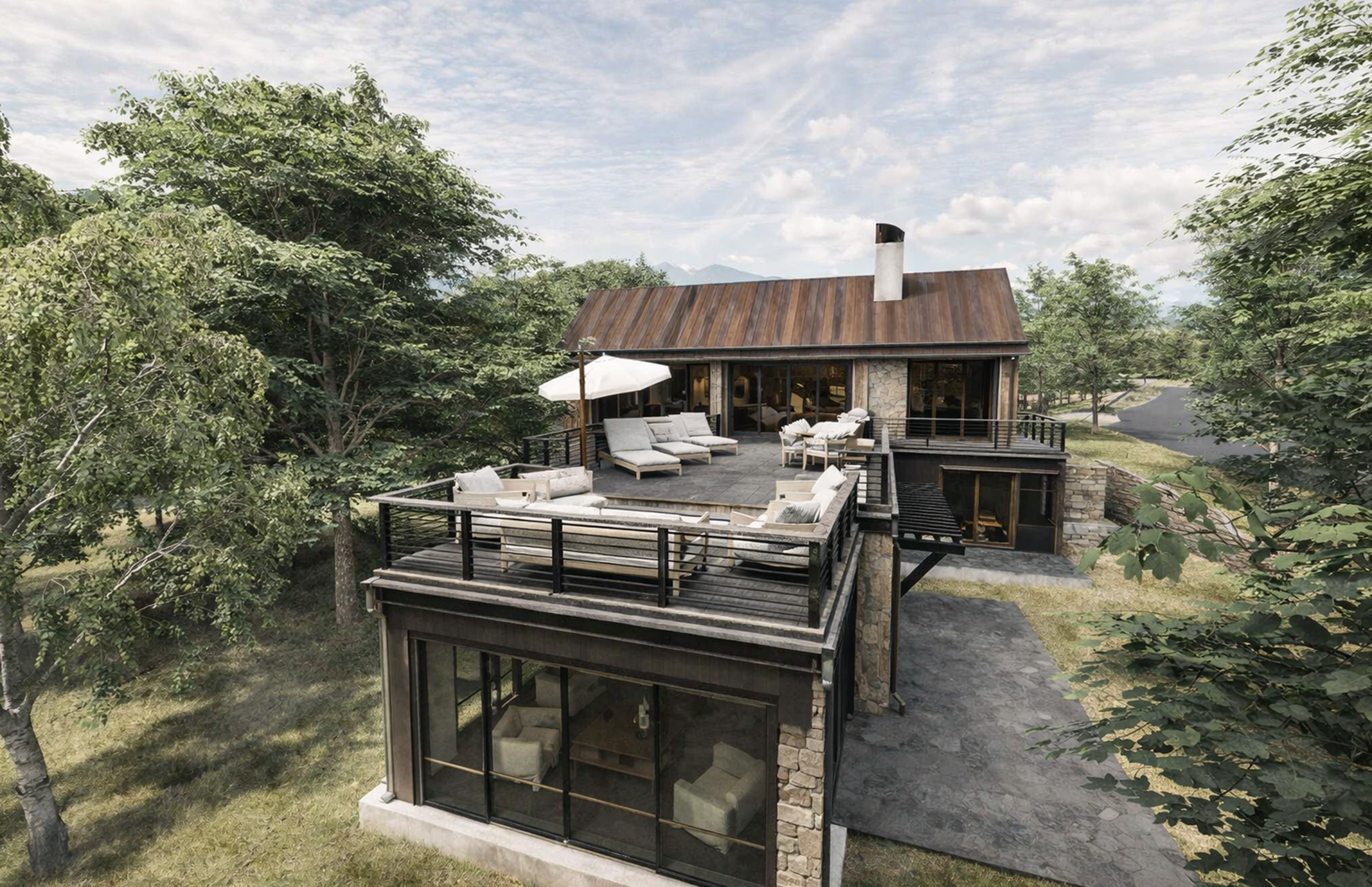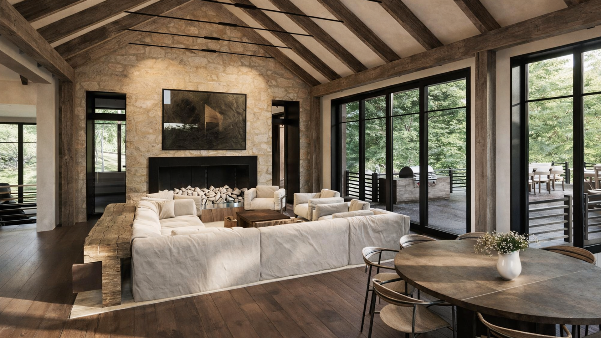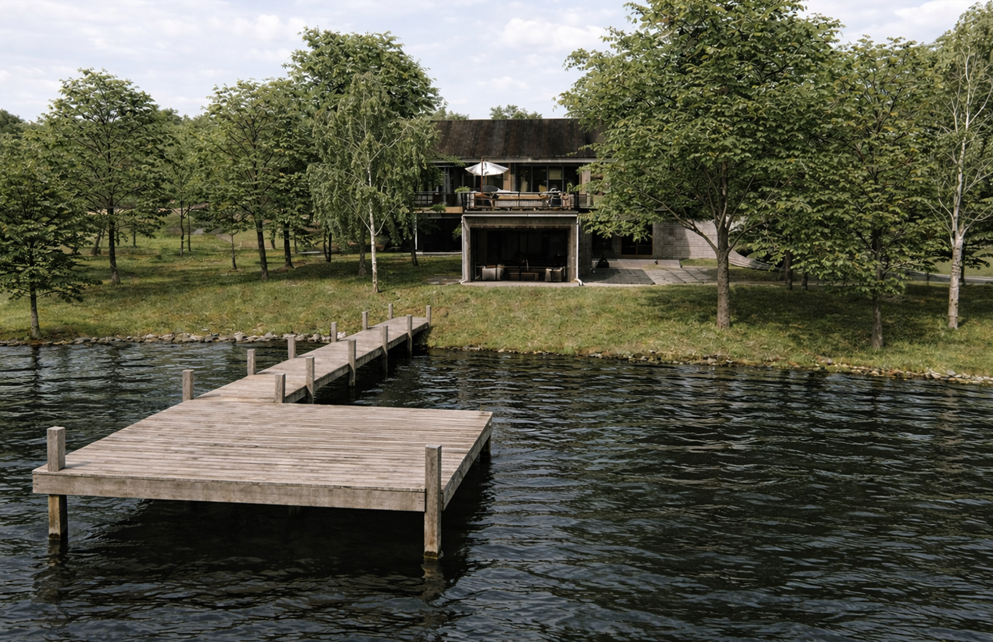 Inside, timber beams and stone accents establish a framework of warmth and permanence, shaping interiors that feel grounded yet open. Every detail is conceived to settle the architecture gently into its setting, creating a retreat that holds a timeless connection to water, woods, and sky.