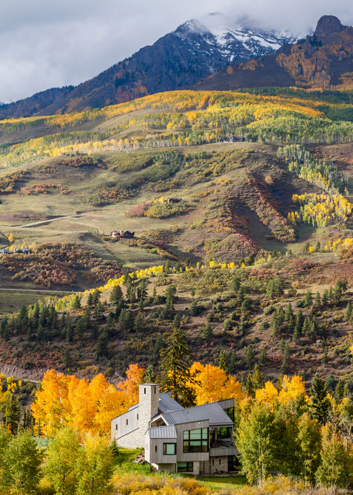 Radial Sheds is an exercise in clarity, intention, and connection—designed to endure quietly, in rhythm with its surroundings. Through the seasons, inside and out, the Caton residence tells a story of harmony with nature—a reflection of living in balance with the world around us. Nestled in Mountain Village, this home honors the land and its history. Inspired by a nearby barn, we reimagined traditional Western forms with a modern touch, using indigenous materials and embracing the natural topography. Each angle frames the San Sophia Ridge, capturing light and life as they flow and evolve throughout the year.