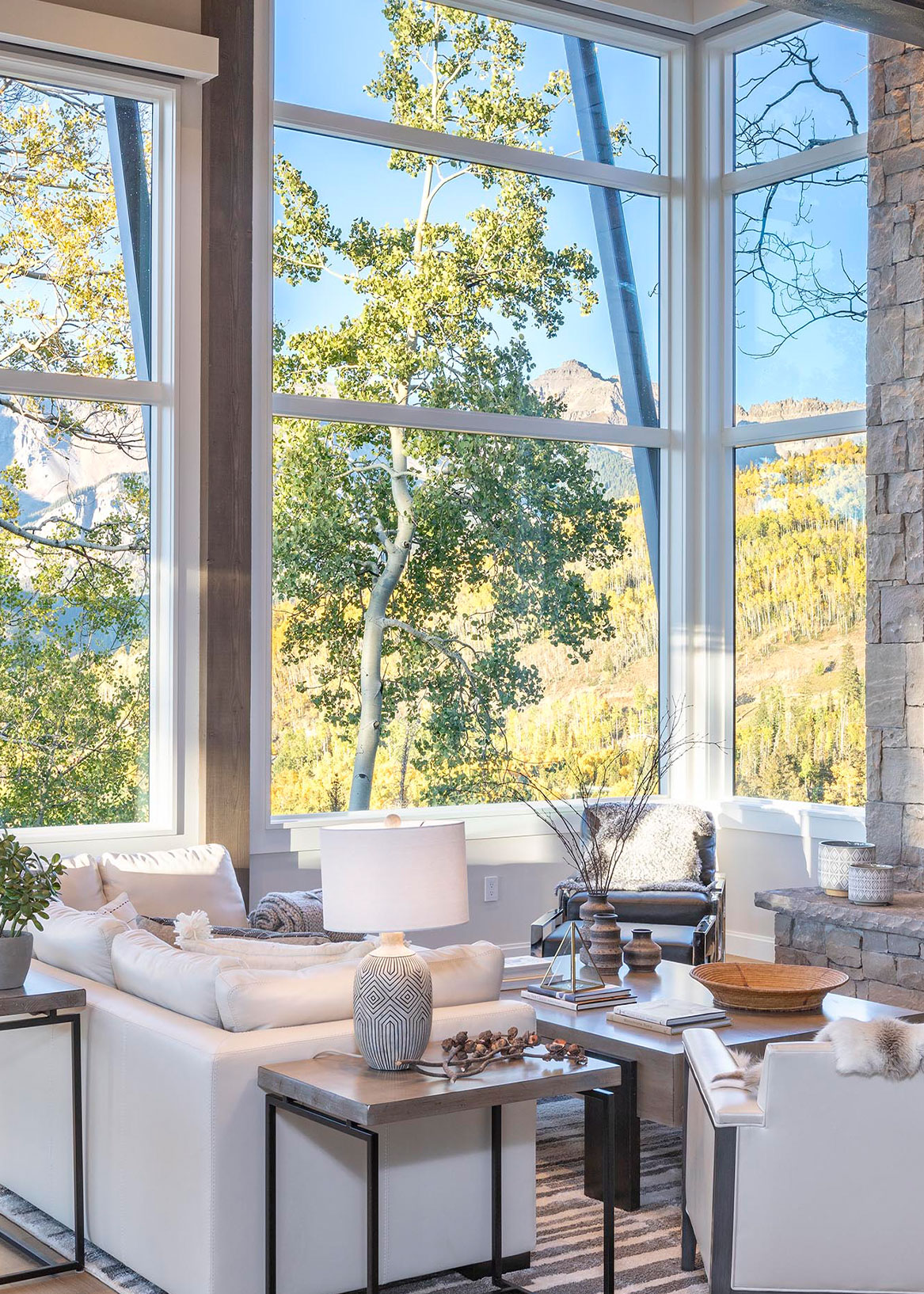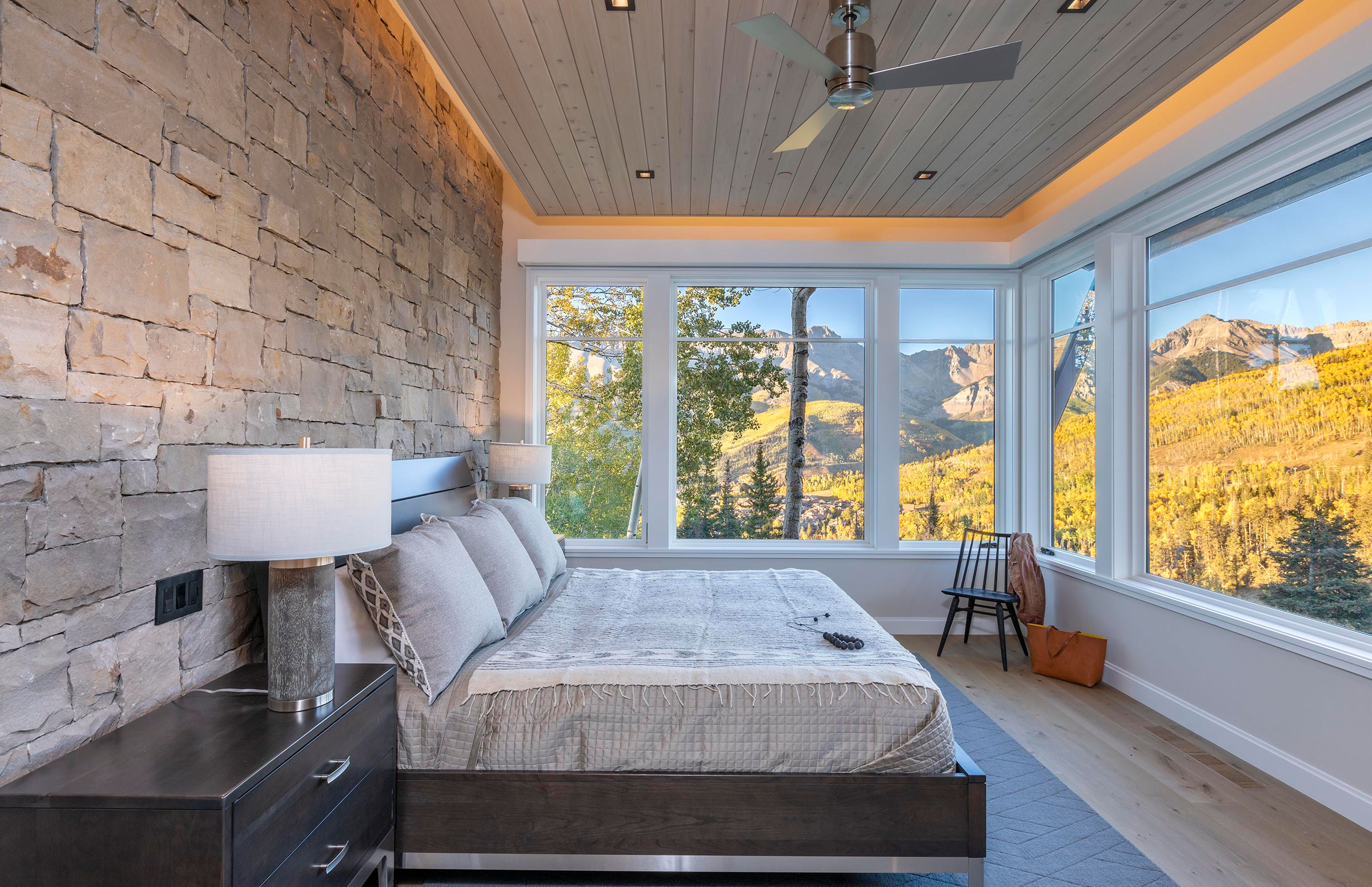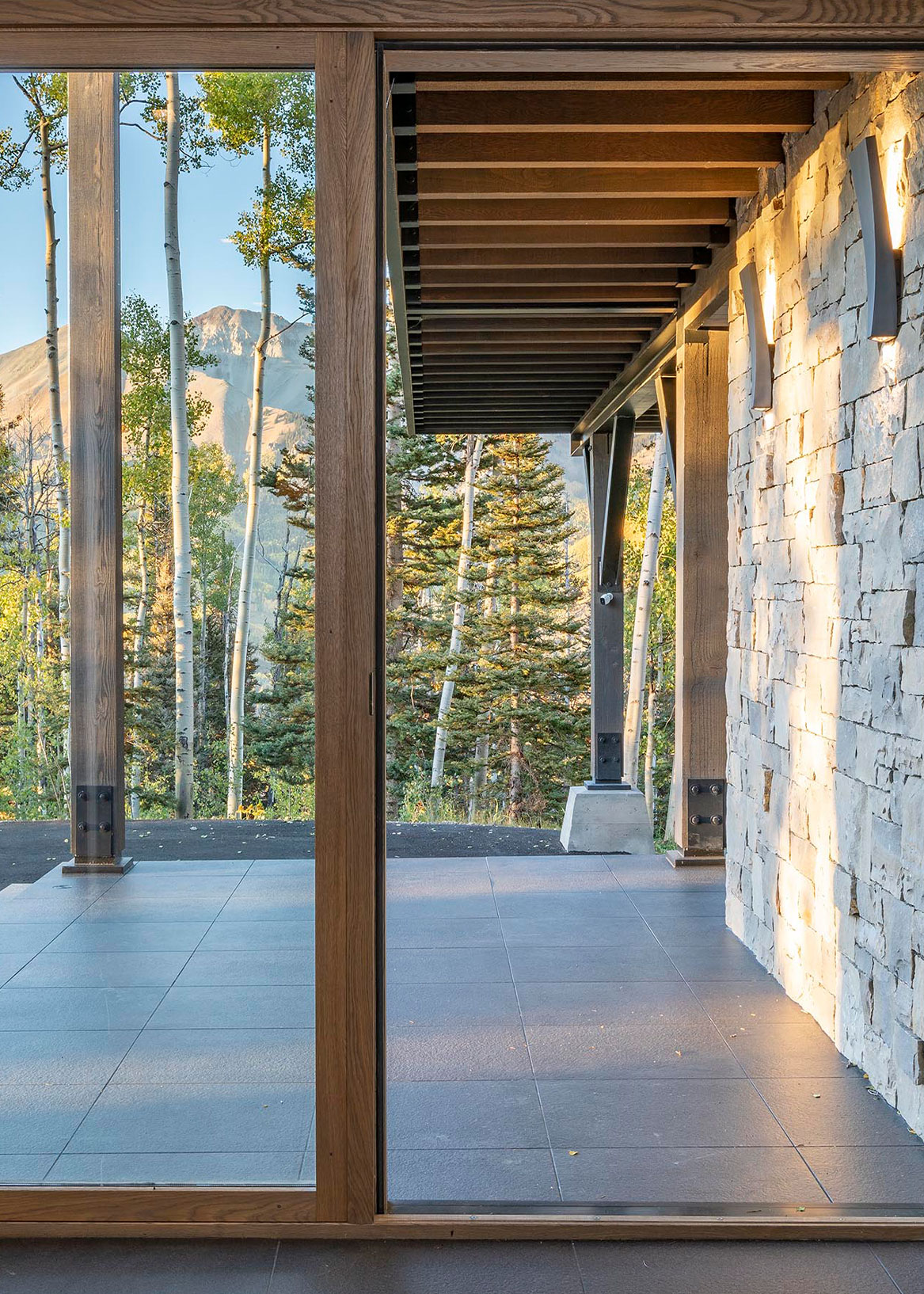Situated within its steep alpine site, this Mountain Village home is oriented to frame the San Juan Mountains from every angle. Tall windows open the interiors to sweeping views, while stone walls extend inside, rooting the spaces in the landscape.