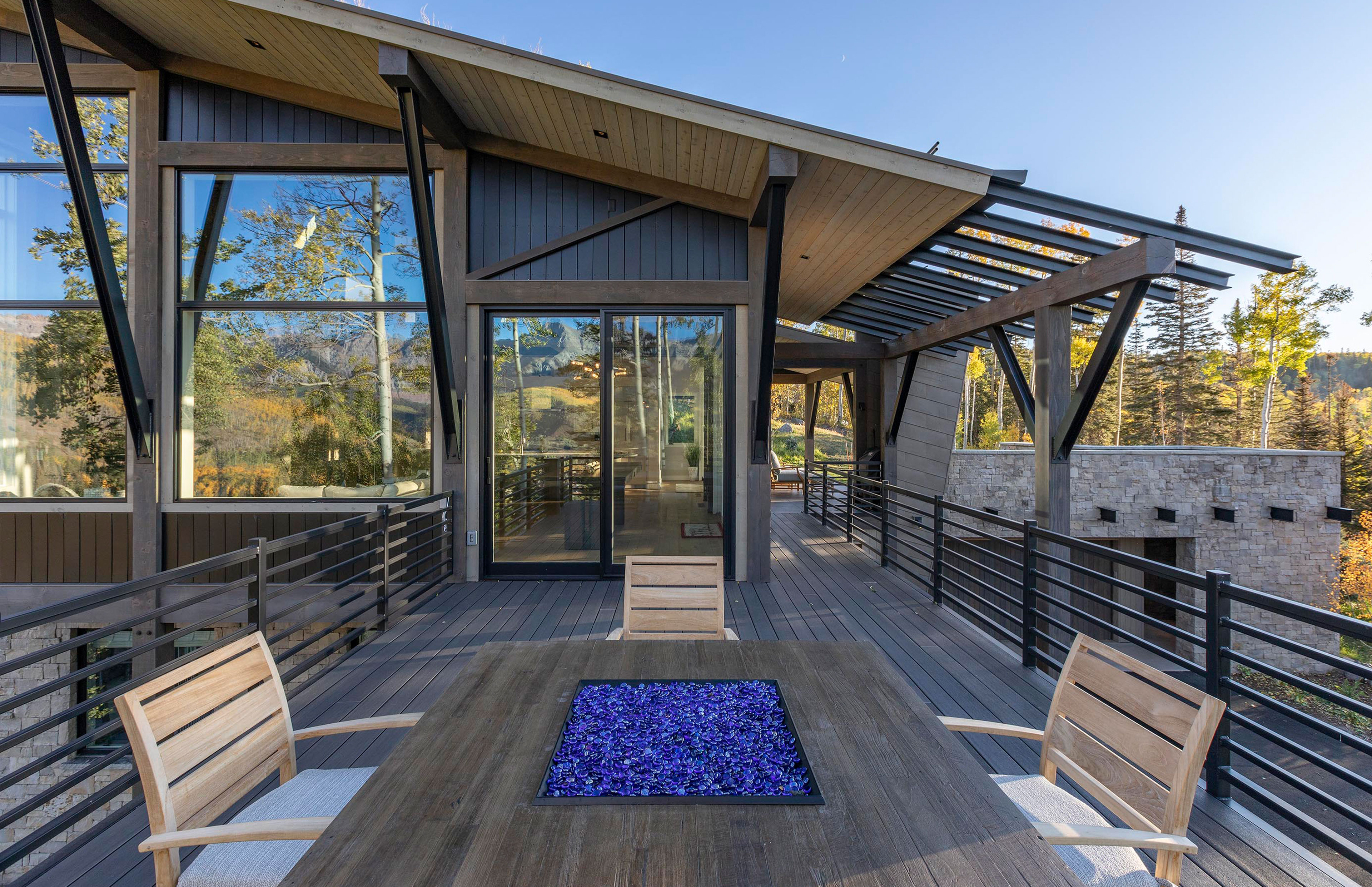 Set into a steep alpine site, this Mountain Village home frames the San Juans with expansive glass, stone, and steel—rugged in spirit yet refined in detail.