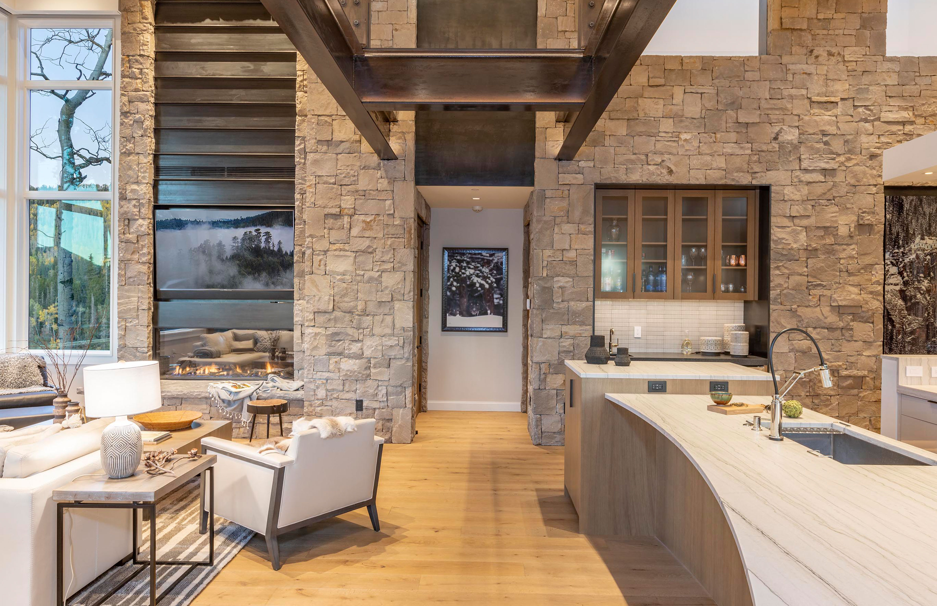 Exposed steel beams call to the region’s mining heritage, grounding the architecture in place and time. Rugged yet refined, the residence reflects the deep history of the area while embracing the stunning views of the surrounding peaks.