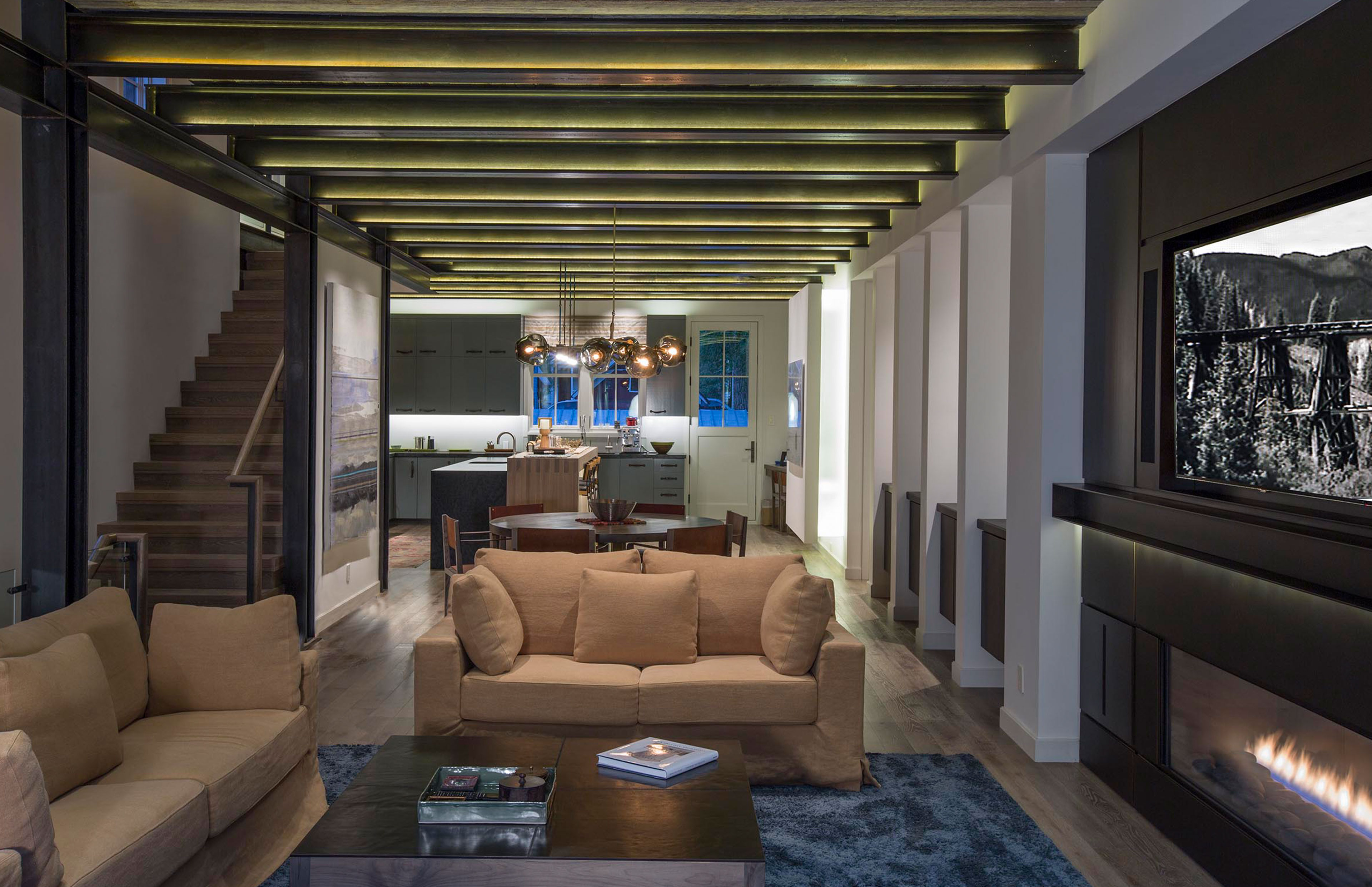 In the Depot neighborhood, where Telluride’s rail history once defined the landscape, this home draws inspiration from the industrial architecture of that era. Its form takes cues from the slightly skewed walls and rooflines that characterized many of the town’s historic buildings, creating a structure that feels rooted in its past while aligned with contemporary life.