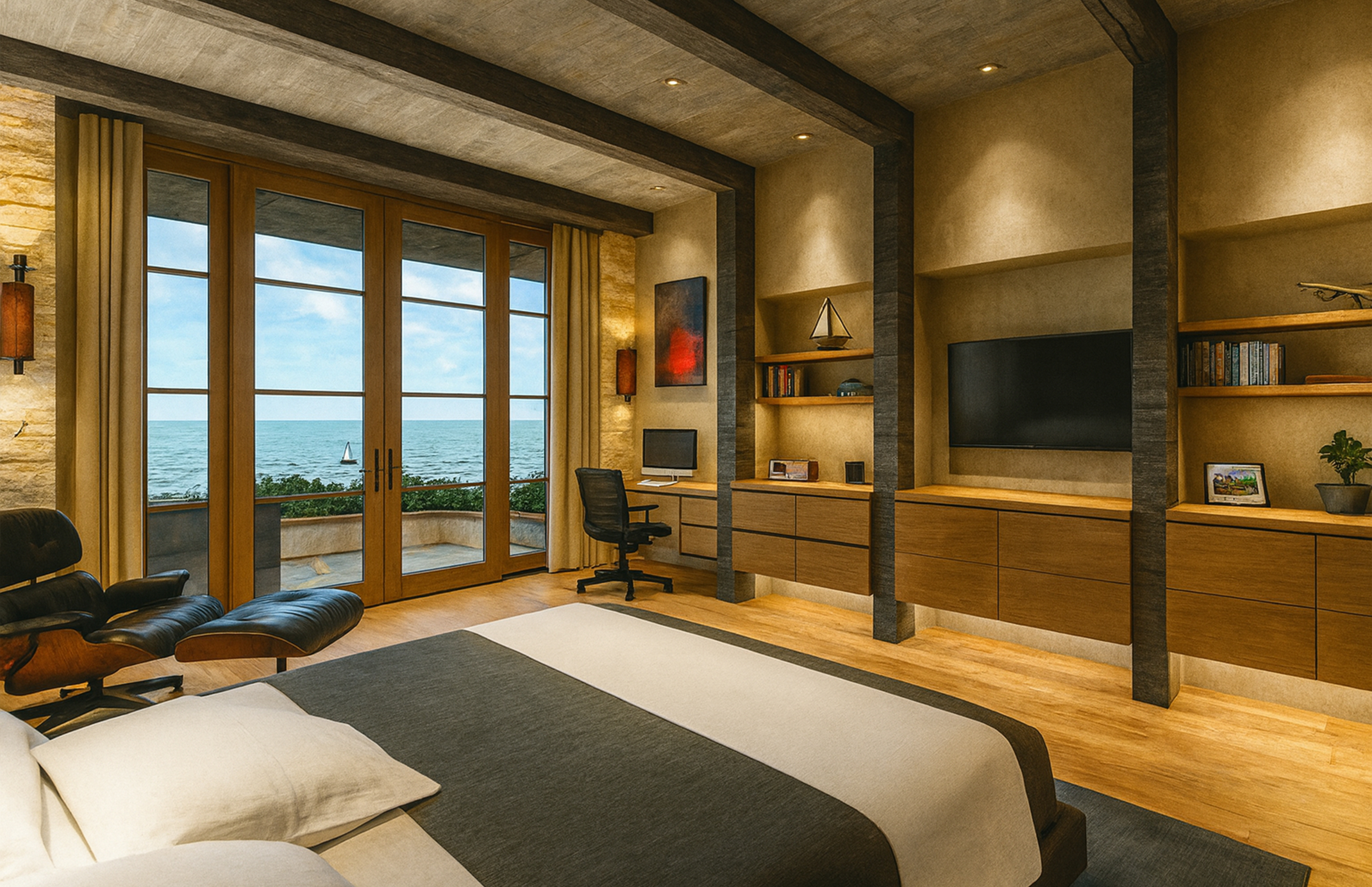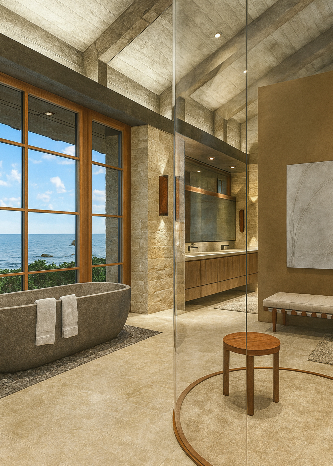 Courtyards and terraces extend the living spaces outdoors, connecting interiors to gardens and the ocean beyond. A balance of warmth, heritage, and simplicity defines the design, offering a retreat that is both grounded in place and elevated by its coastal setting.