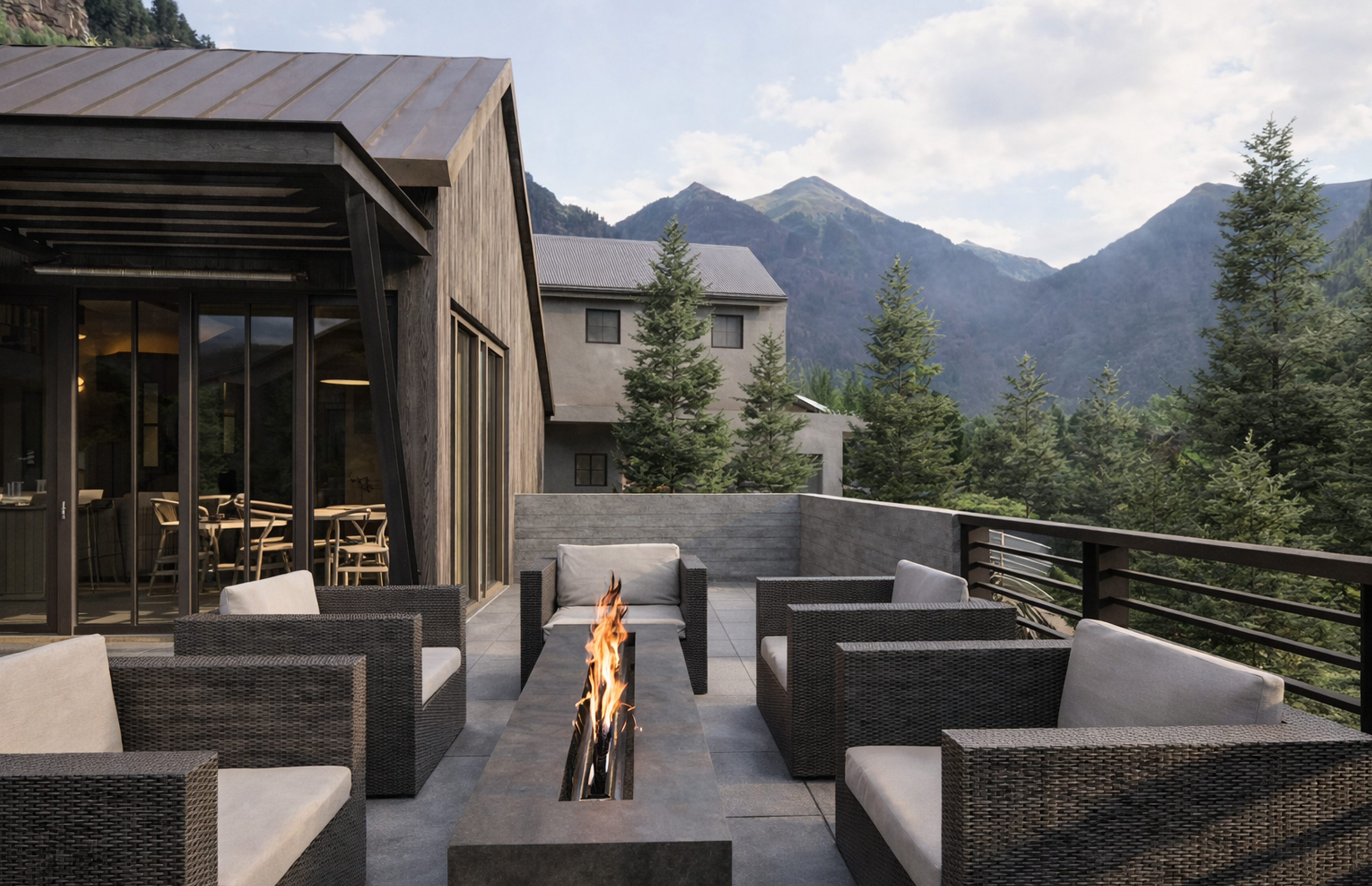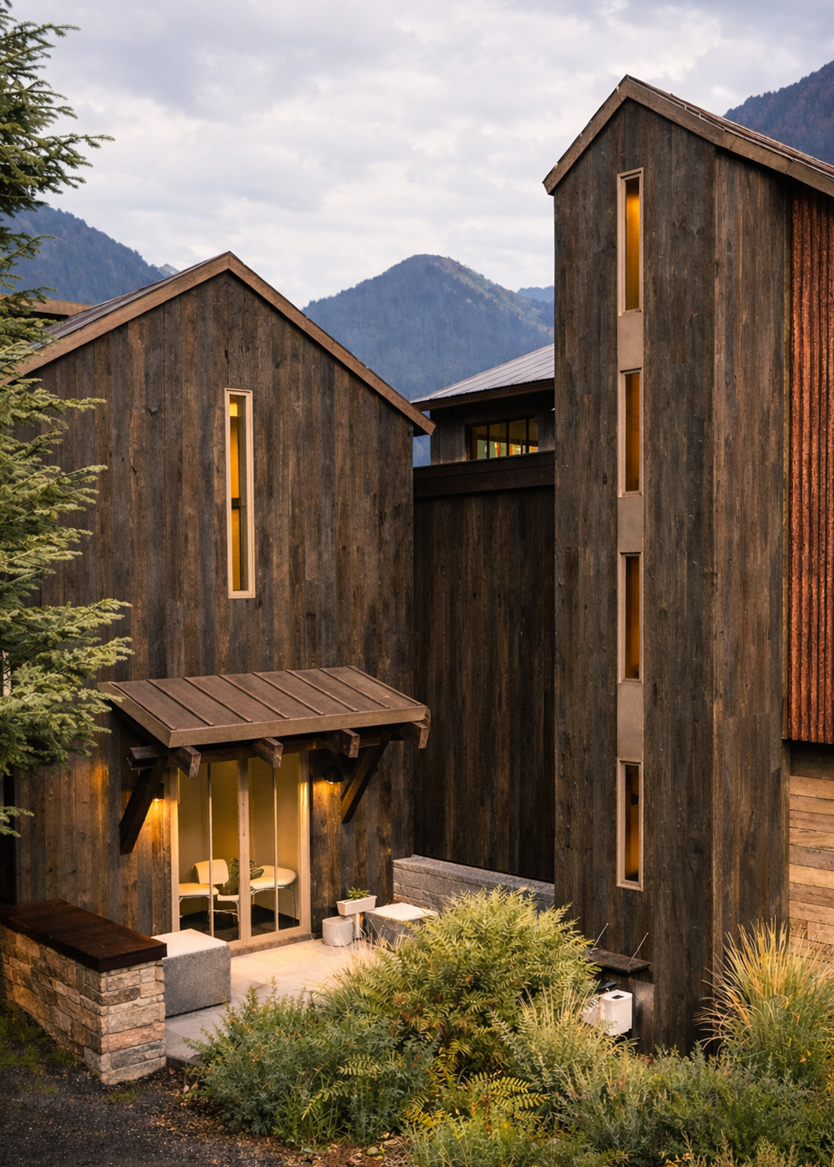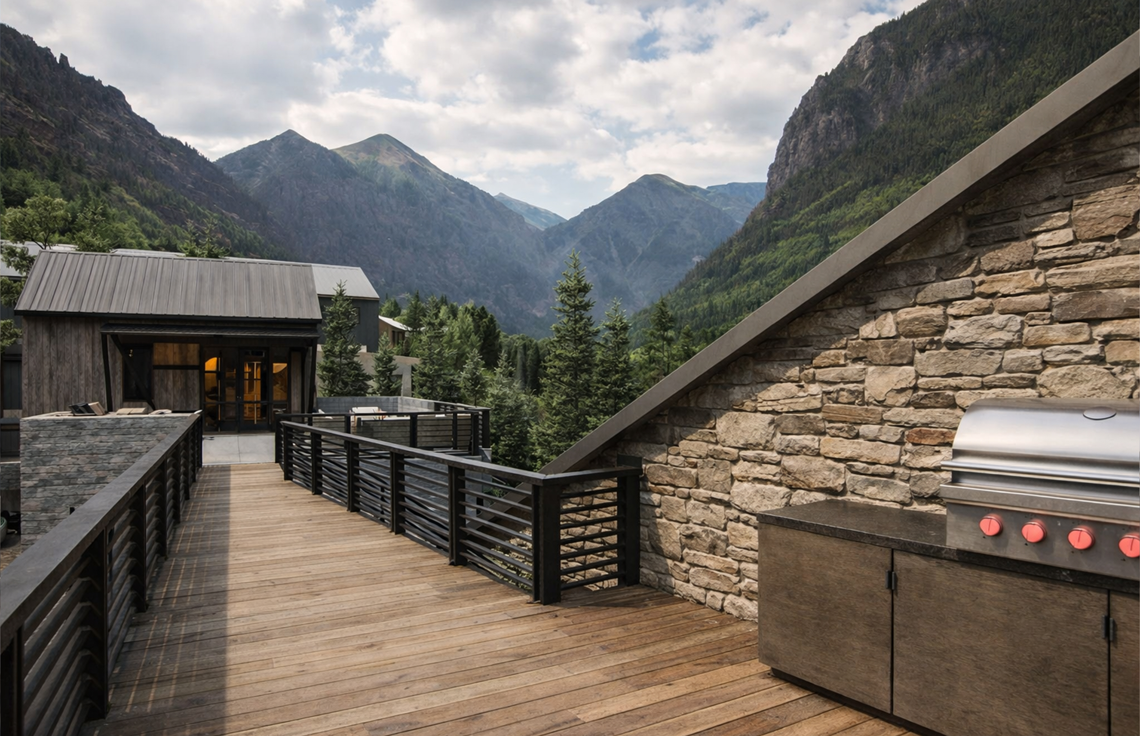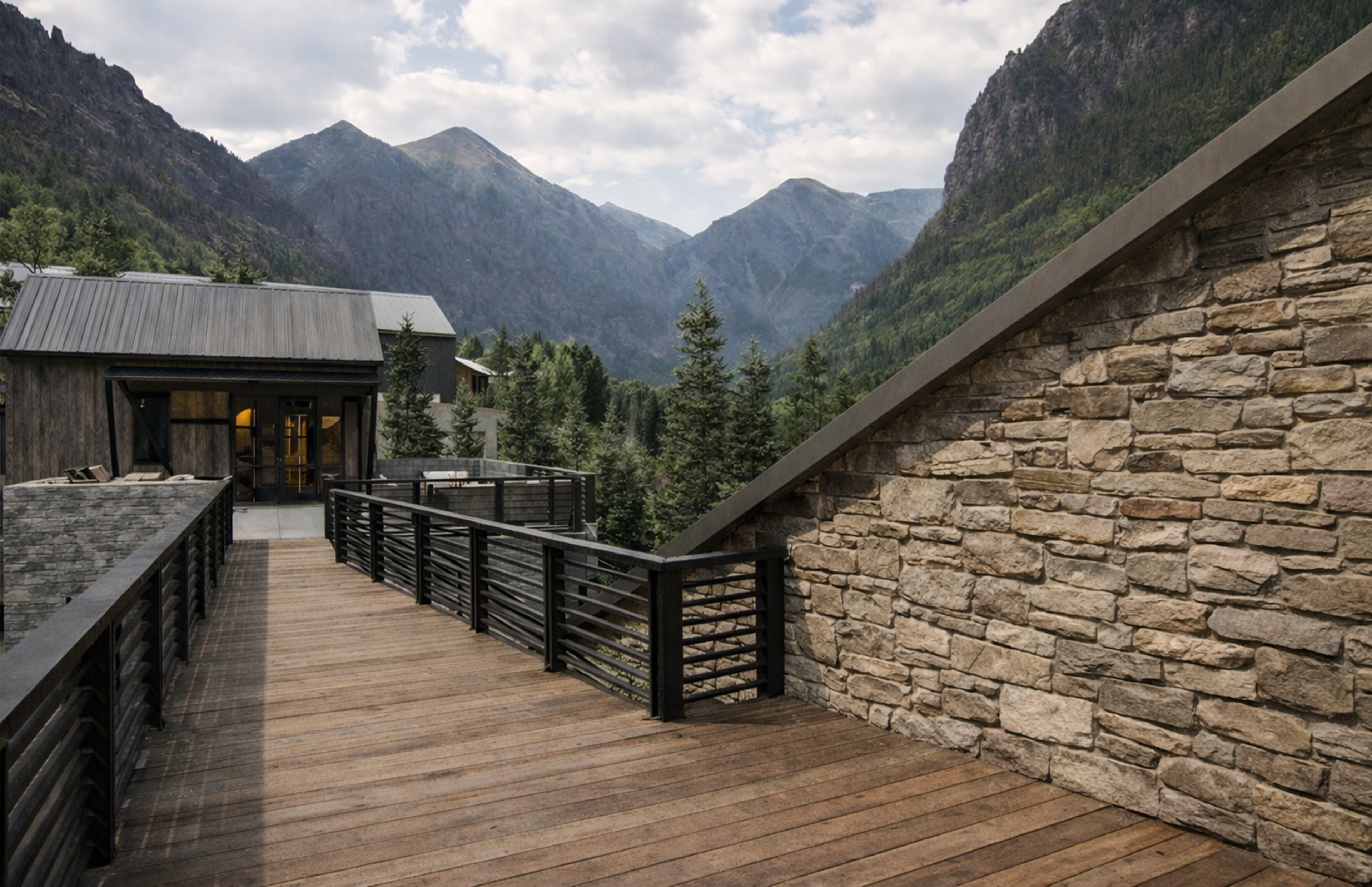 The architecture draws from Telluride’s mining vernacular: compact forms, sloped roofs, and a palette of board-formed concrete, Telluride Gold stone, rusted steel, and barnwood. A new western wing gathers kitchen, dining, and wellness spaces, while the former garage becomes a quiet primary suite, linked by a series of decks and terraces. The result is a layered composition—modest, enduring, and grounded in place.