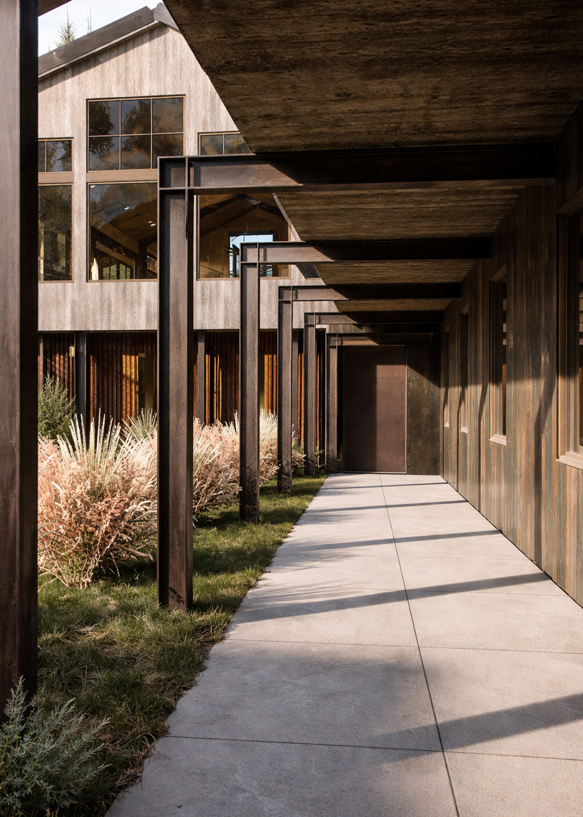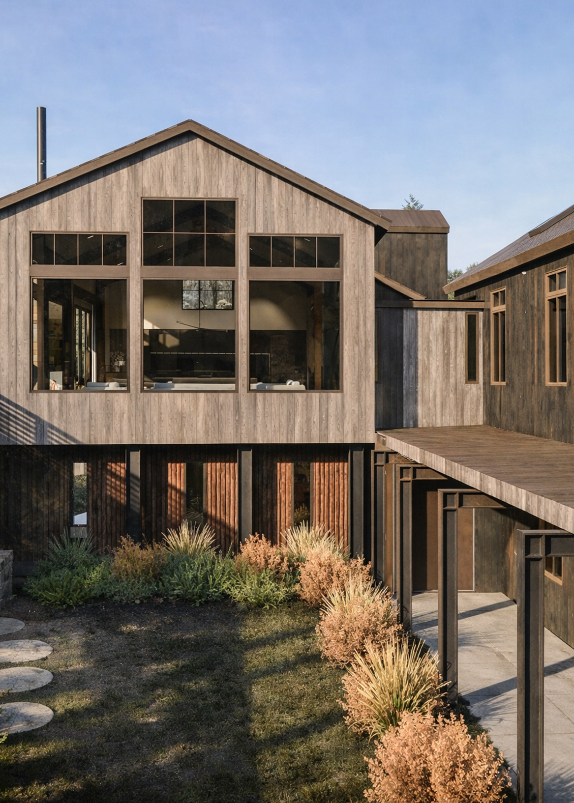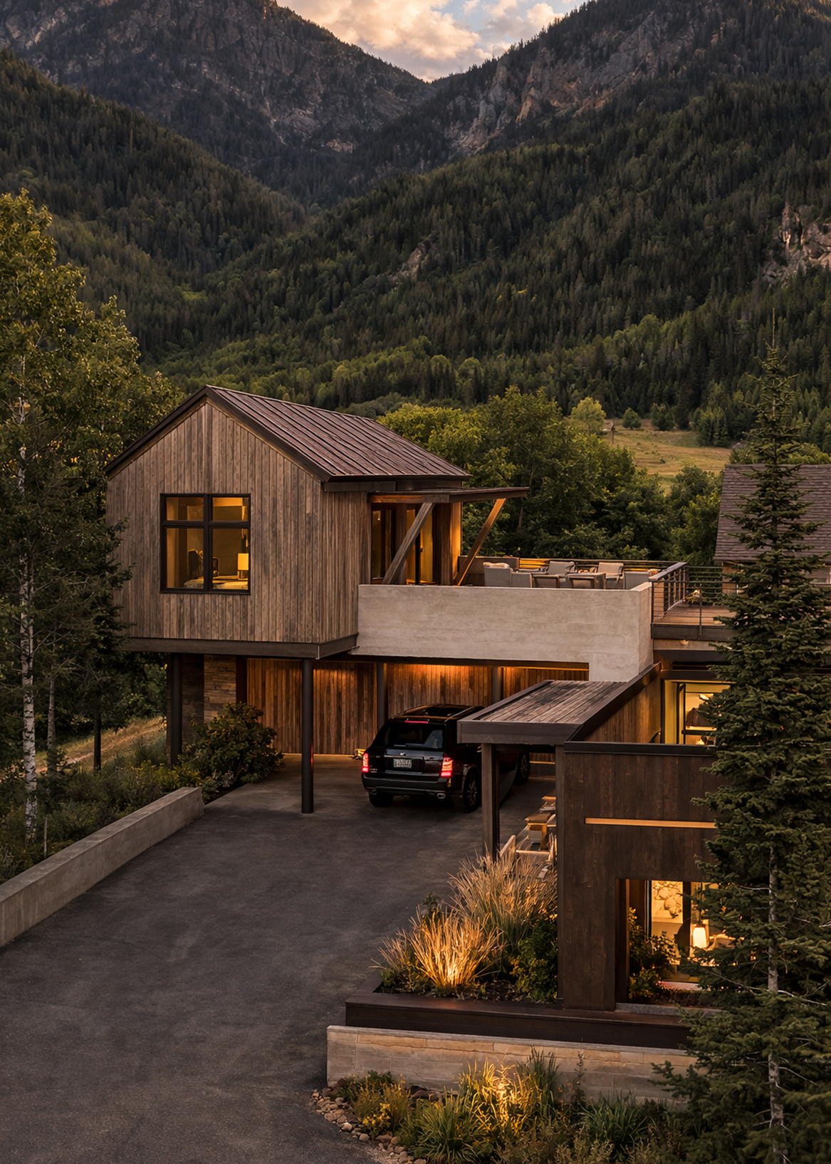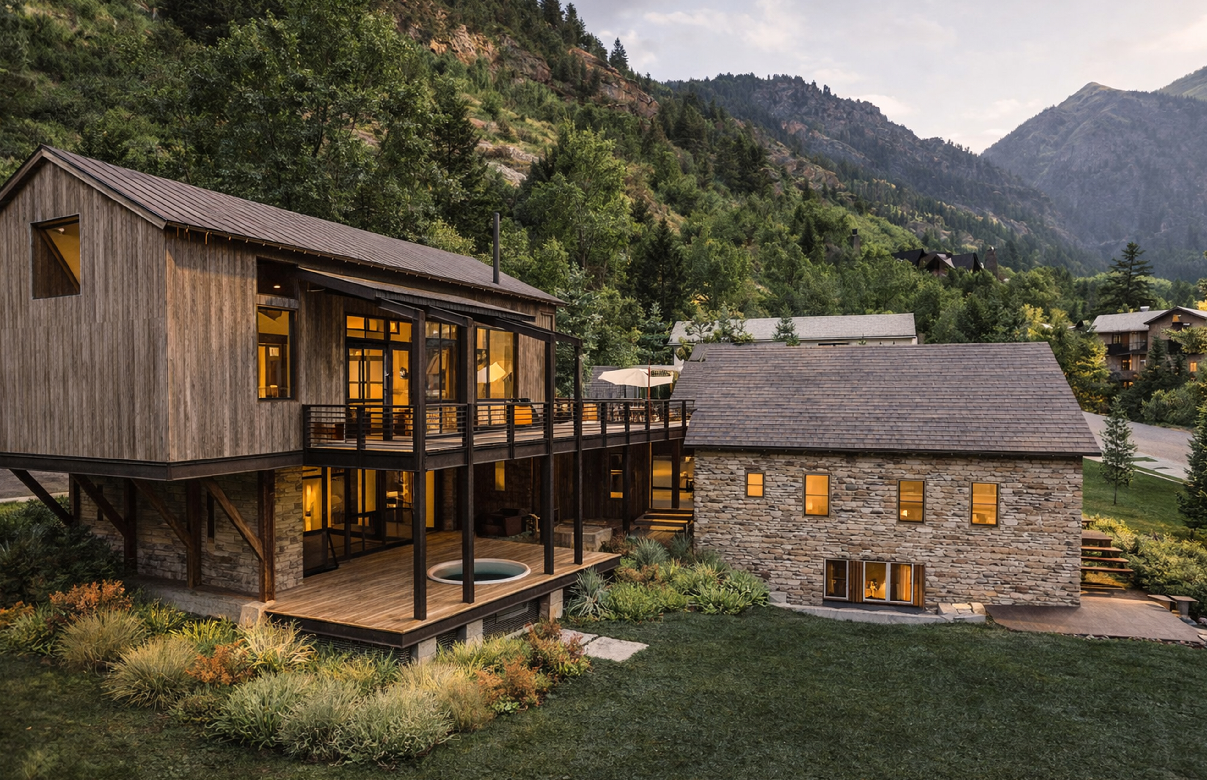 The architecture draws from Telluride’s mining vernacular: compact forms, sloped roofs, and a palette of board-formed concrete, Telluride Gold stone, rusted steel, and barnwood. A new western wing gathers kitchen, dining, and wellness spaces, while the former garage becomes a quiet primary suite, linked by a series of decks and terraces. The result is a layered composition—modest, enduring, and grounded in place.