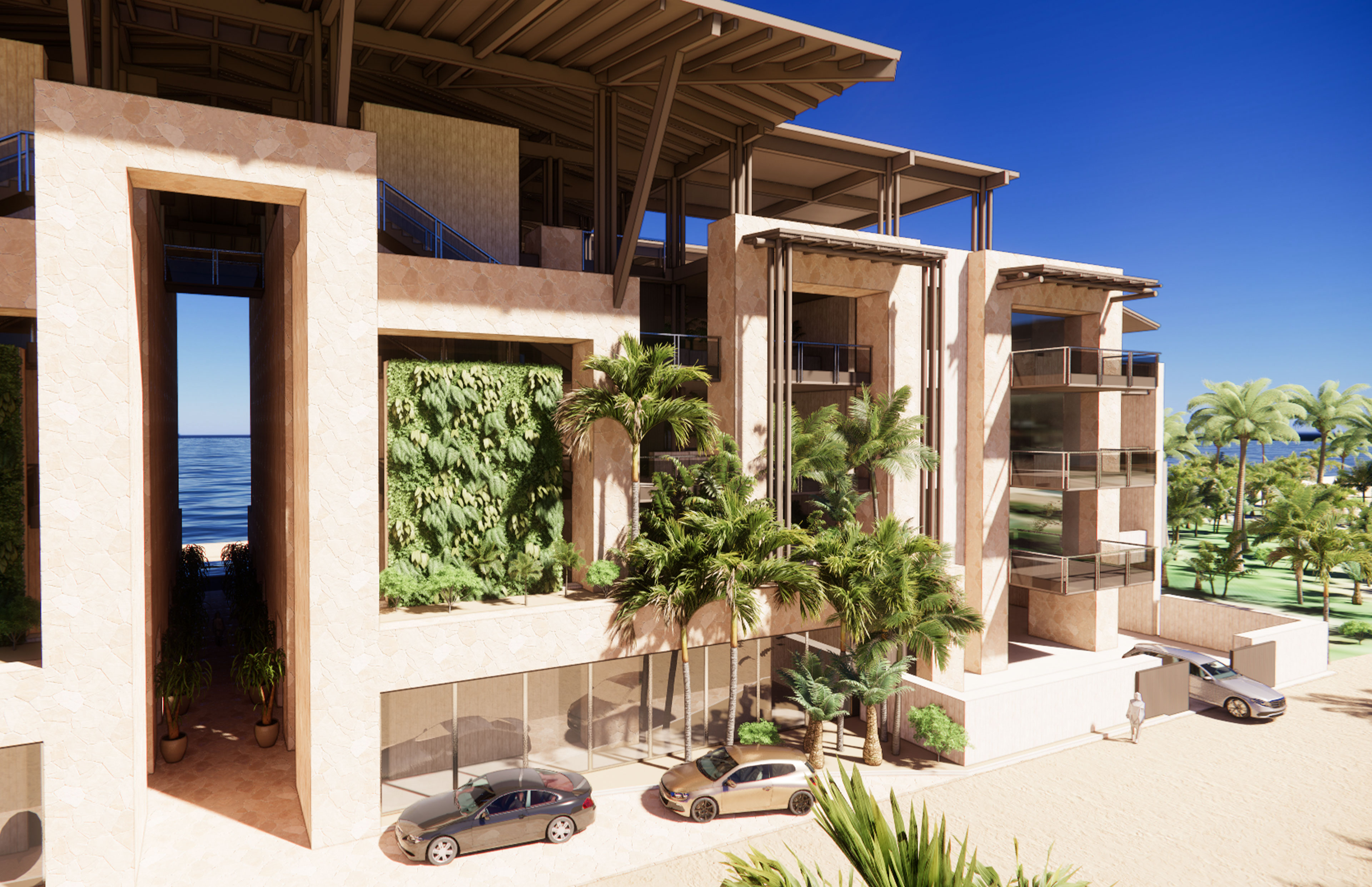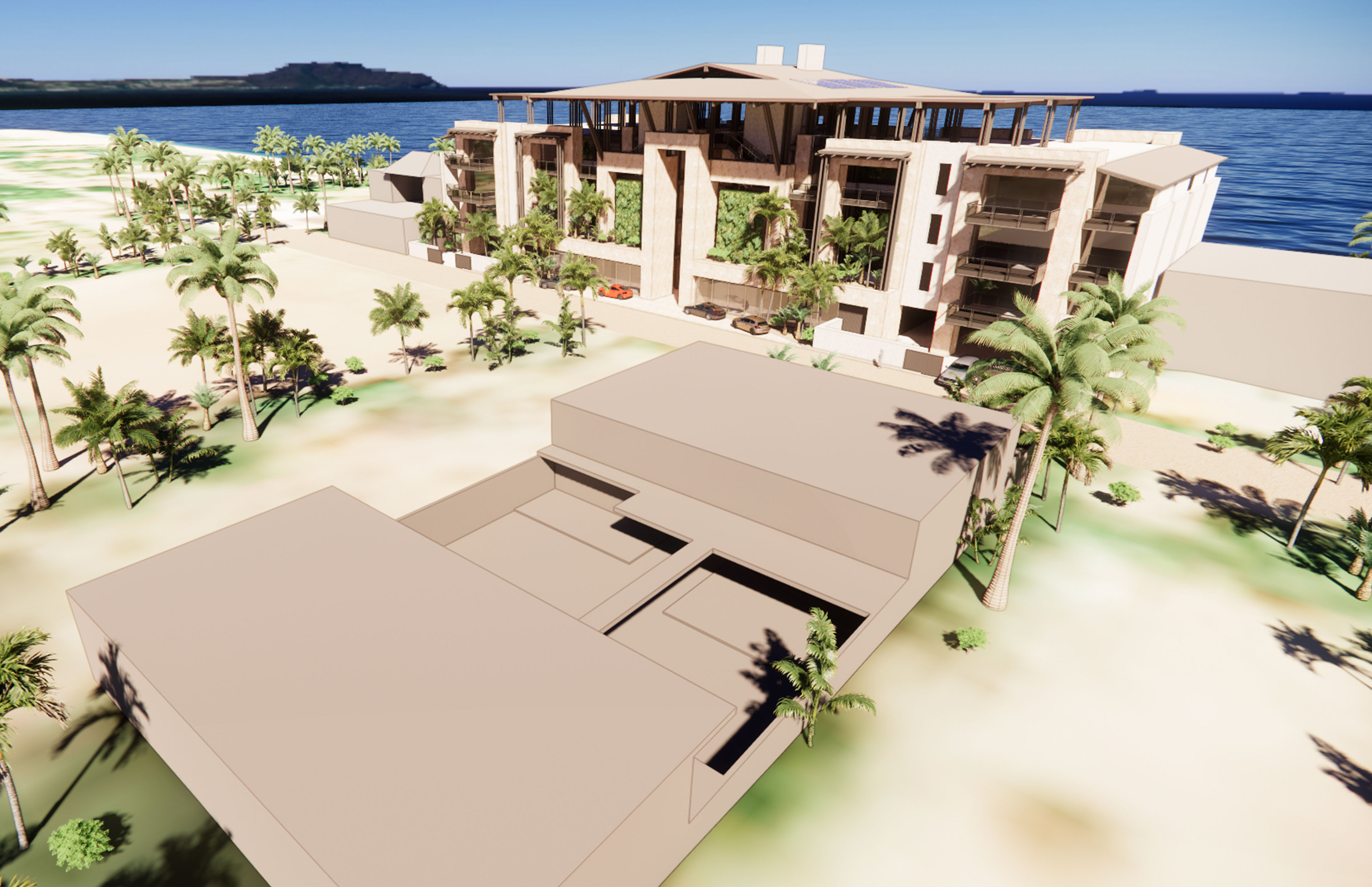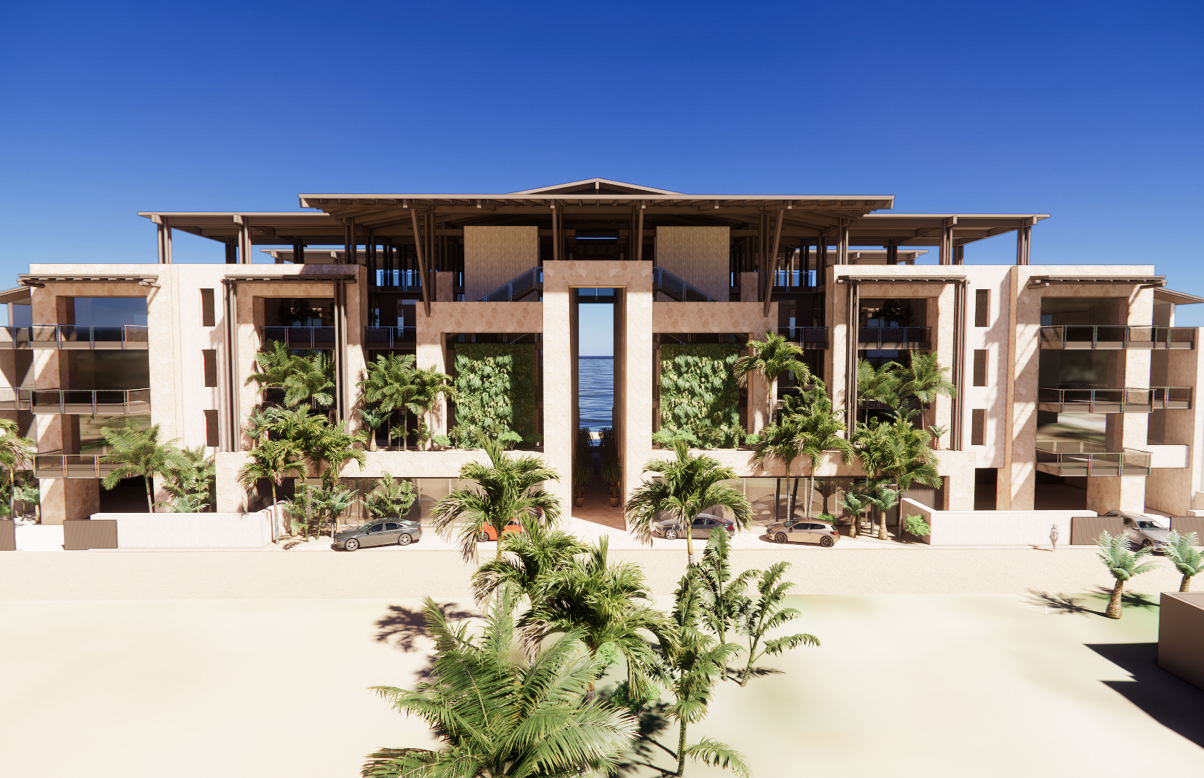 A rooftop bar crowns the building, its timber structure offering shade, breeze, and an open view to the horizon. On the ground level, spaces open fully to the beach—where stone, travertine, and wood-toned composites provide texture, durability, and warmth. Across the street, Lot 5 holds the working side of the club: service, staff housing, and quiet support tucked behind the scenes. Designed to age with the climate and require little maintenance, the Beach Club balances industrial clarity with a relaxed, tropical spirit.