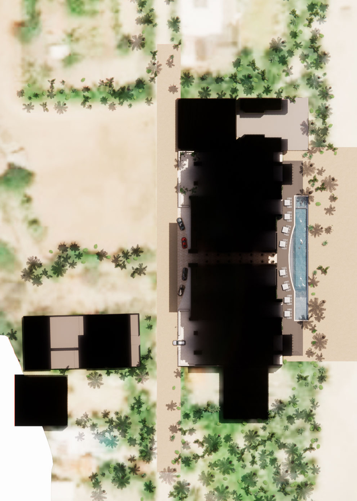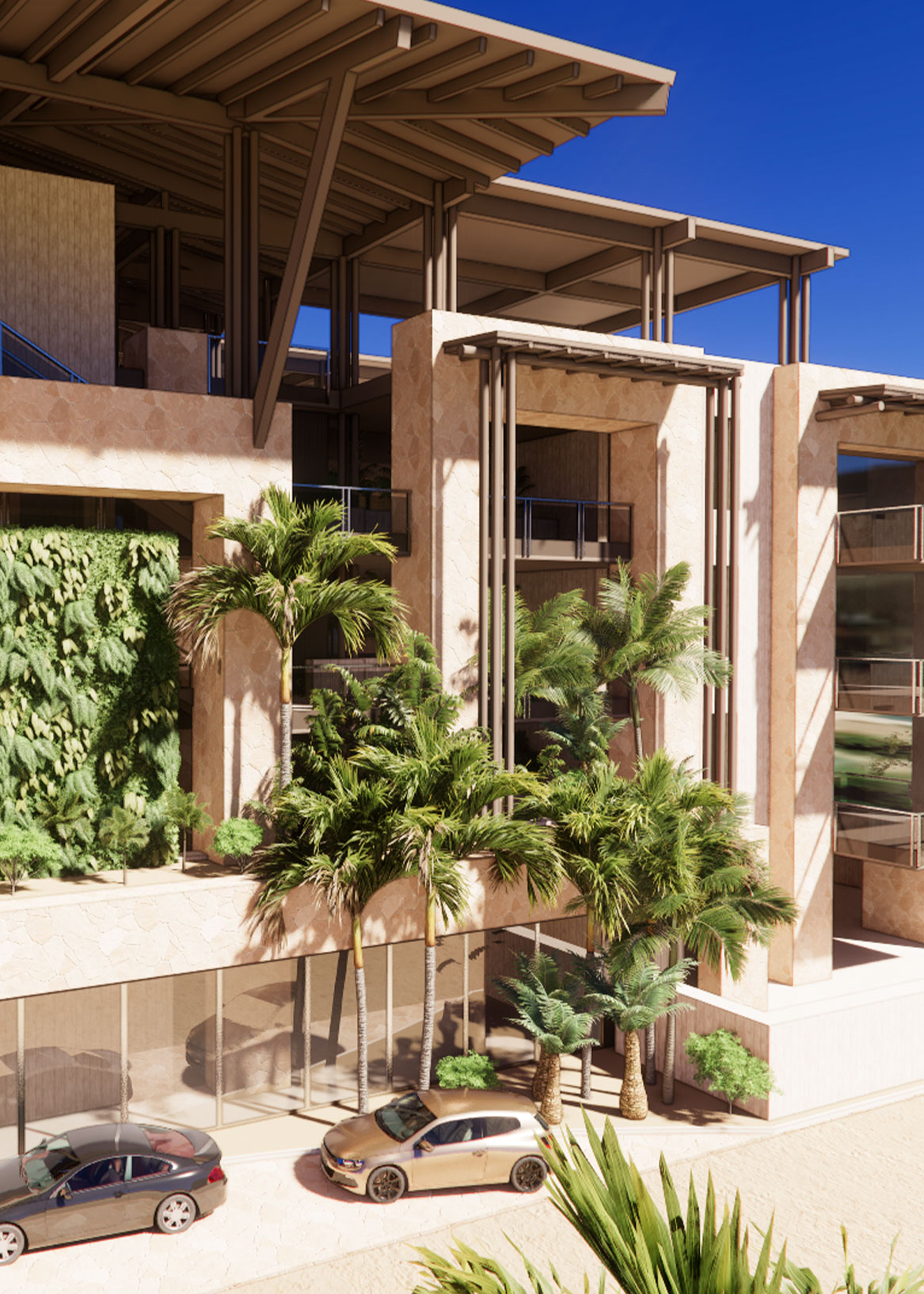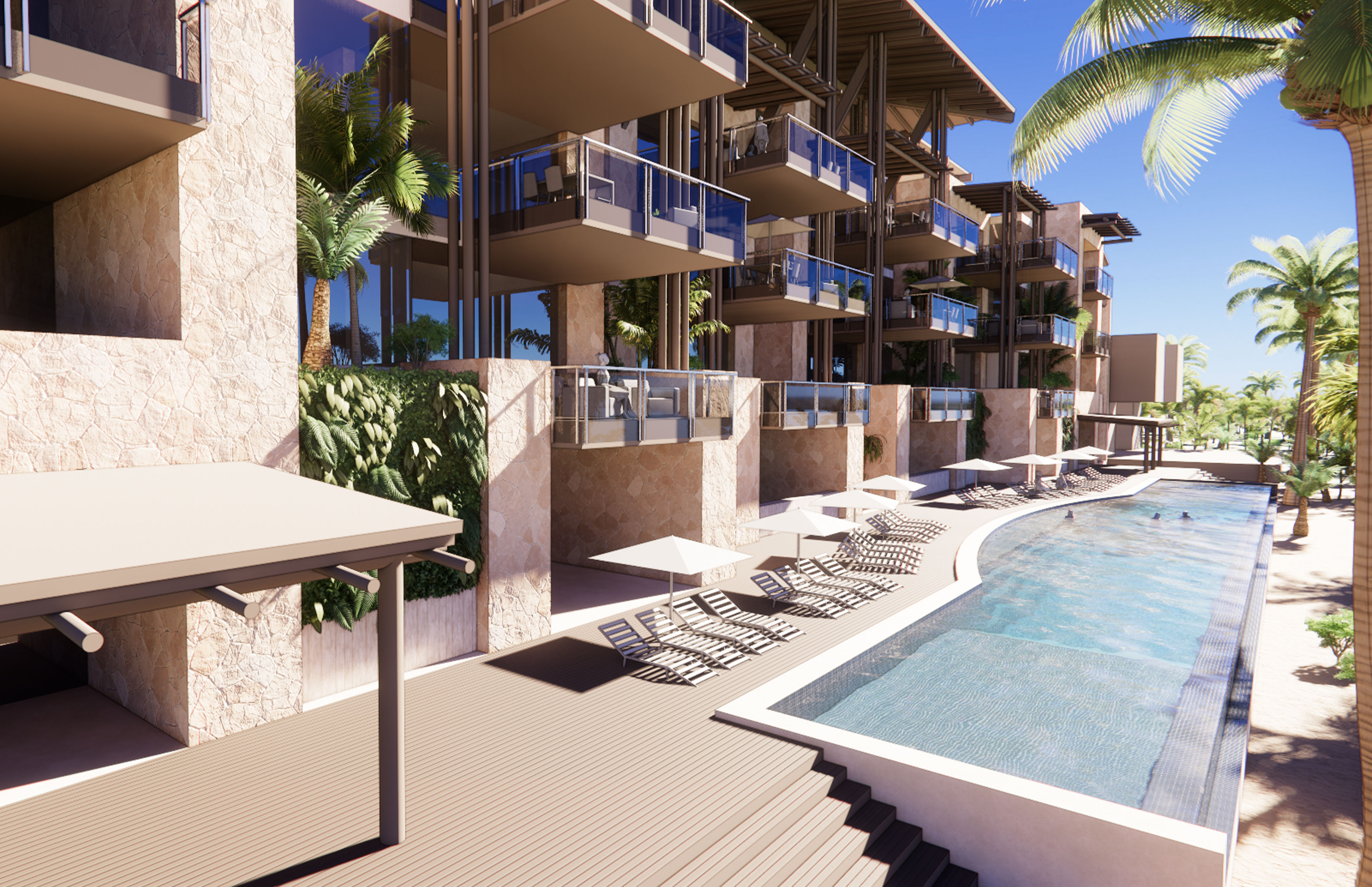 A rooftop bar crowns the building, its timber structure offering shade, breeze, and an open view to the horizon. On the ground level, spaces open fully to the beach—where stone, travertine, and wood-toned composites provide texture, durability, and warmth. Across the street, Lot 5 holds the working side of the club: service, staff housing, and quiet support tucked behind the scenes. Designed to age with the climate and require little maintenance, the Beach Club balances industrial clarity with a relaxed, tropical spirit.