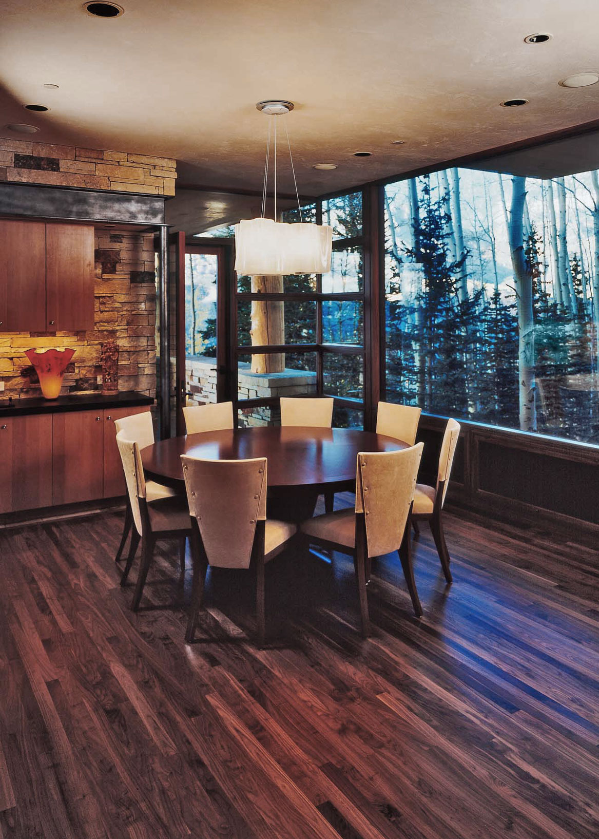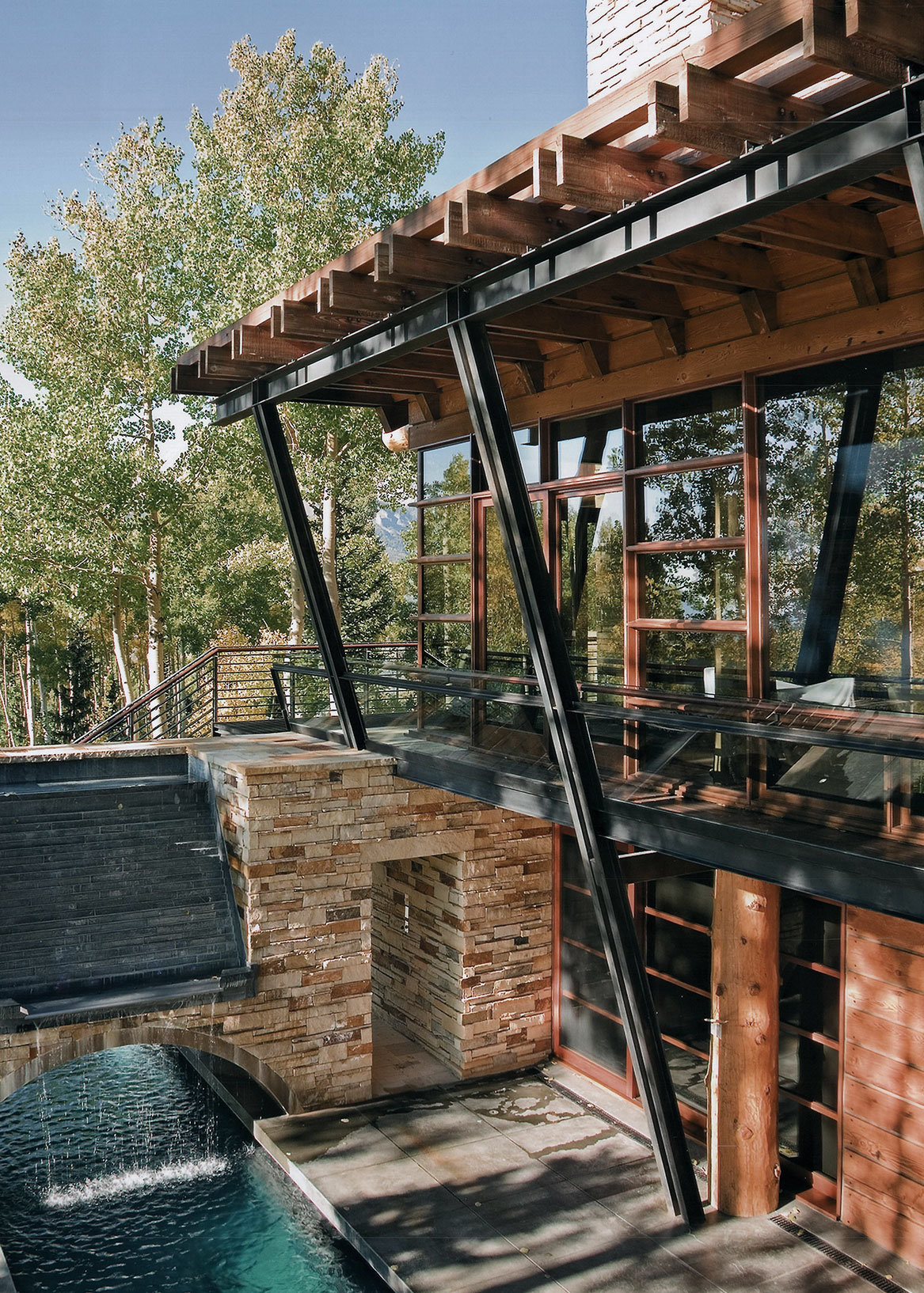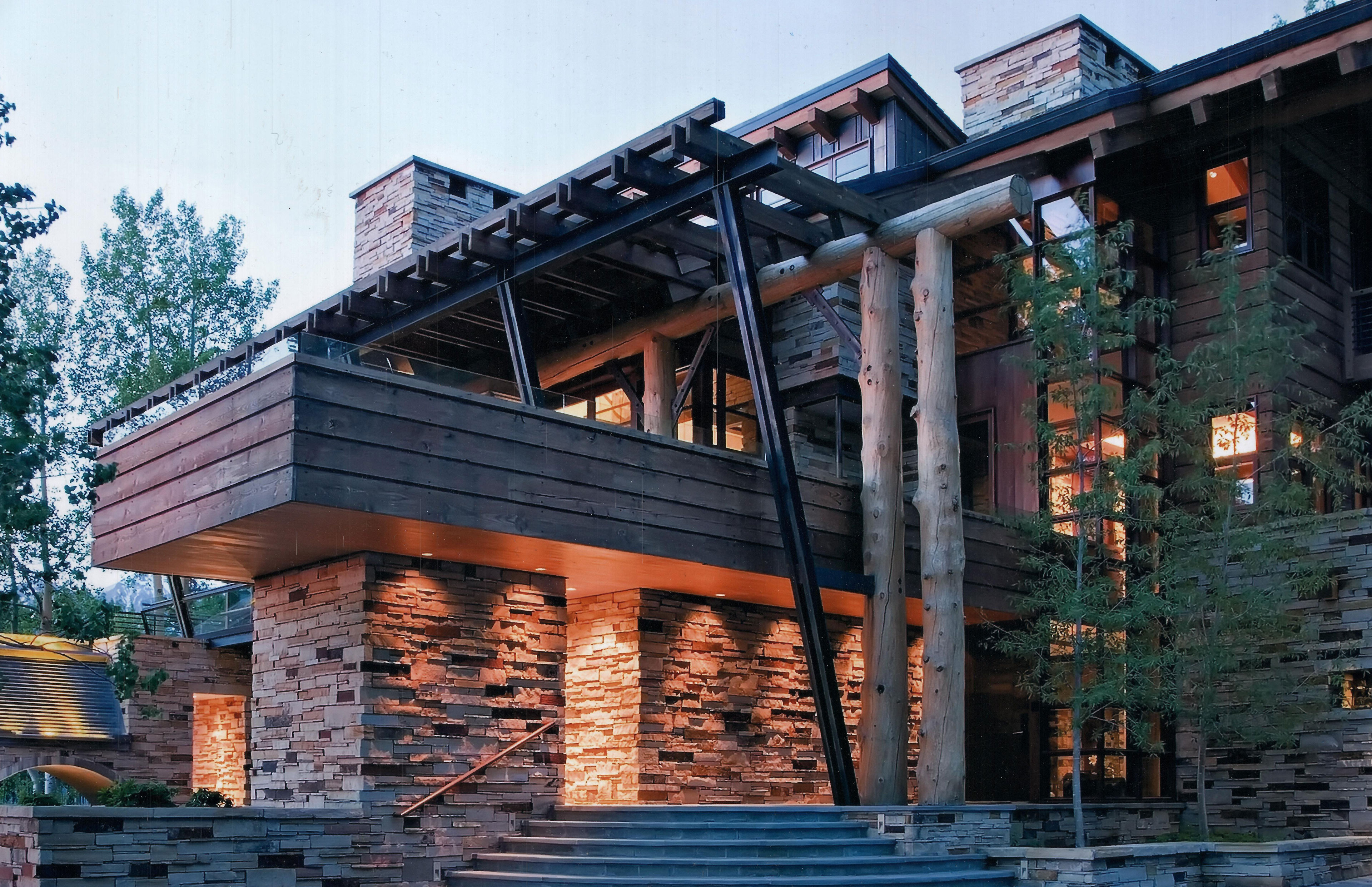 Log and Steel Lodge is nestled into a wooded ridge within the Telluride Ski Resort, conceived as a retreat that seems to grow from the hillside itself. After early studies and feng shui consultations, the approach was reoriented to rise gently from below along a remnant of the historic Boomerang Road, preserving the site’s mature trees and natural clearing. The rooflines follow the slope of the land, while two stone masses anchor the structure to the ridge. Between them, upper bedrooms and offices bridge under a sweeping tent-like roof, supported by Douglas fir beams and log columns that recall a procession of torii gates.