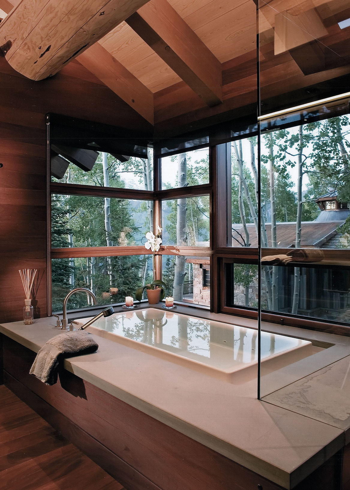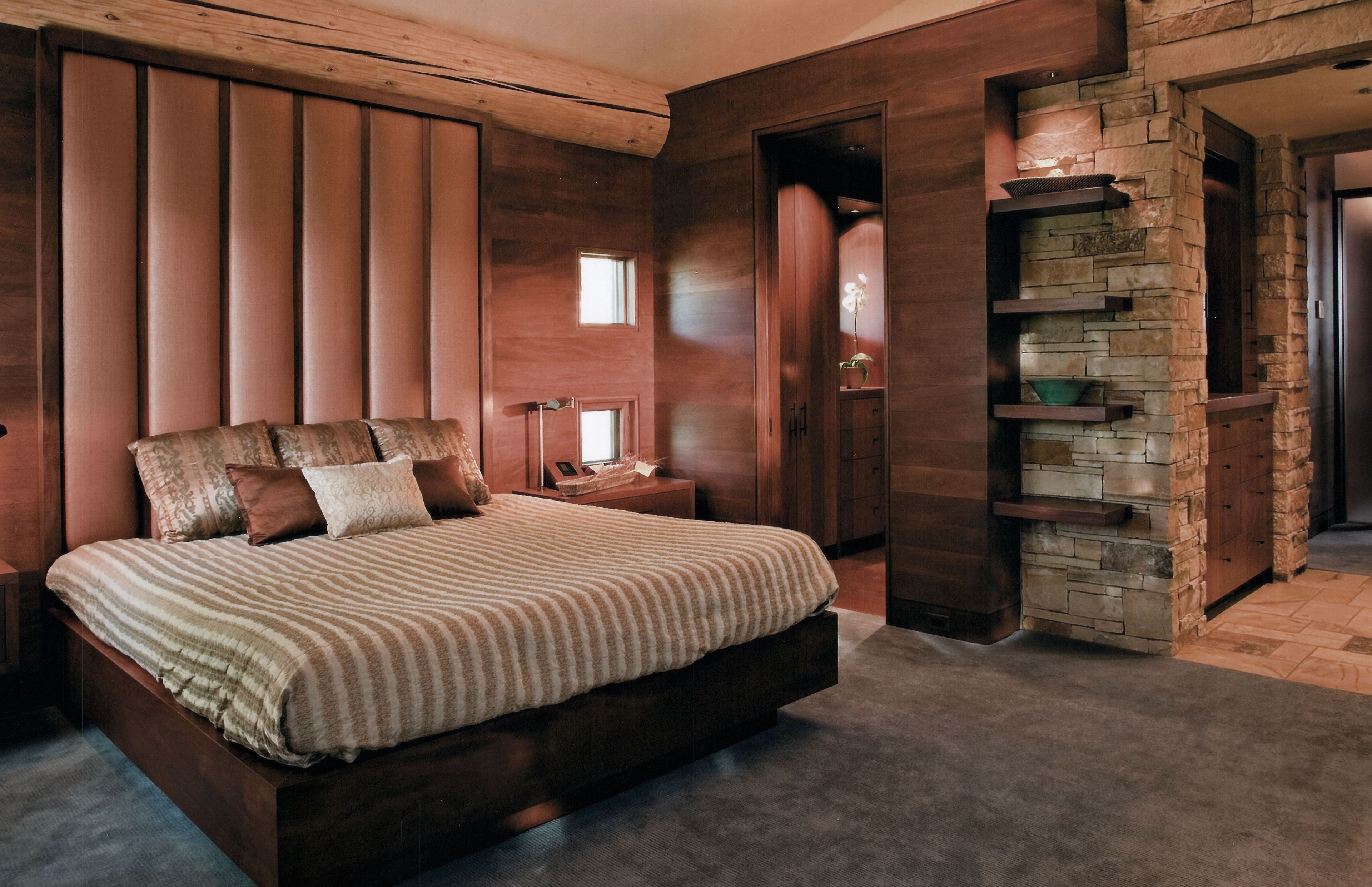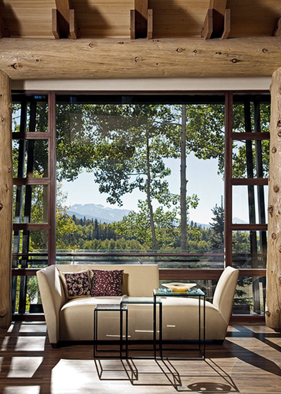 Log and Steel Lodge is nestled into a wooded ridge within the Telluride Ski Resort, conceived as a retreat that seems to grow from the hillside itself. After early studies and feng shui consultations, the approach was reoriented to rise gently from below along a remnant of the historic Boomerang Road, preserving the site’s mature trees and natural clearing. The rooflines follow the slope of the land, while two stone masses anchor the structure to the ridge. Between them, upper bedrooms and offices bridge under a sweeping tent-like roof, supported by Douglas fir beams and log columns that recall a procession of torii gates.