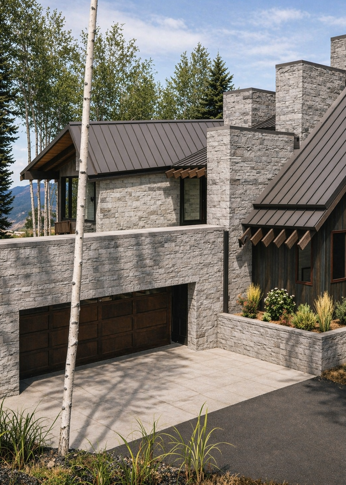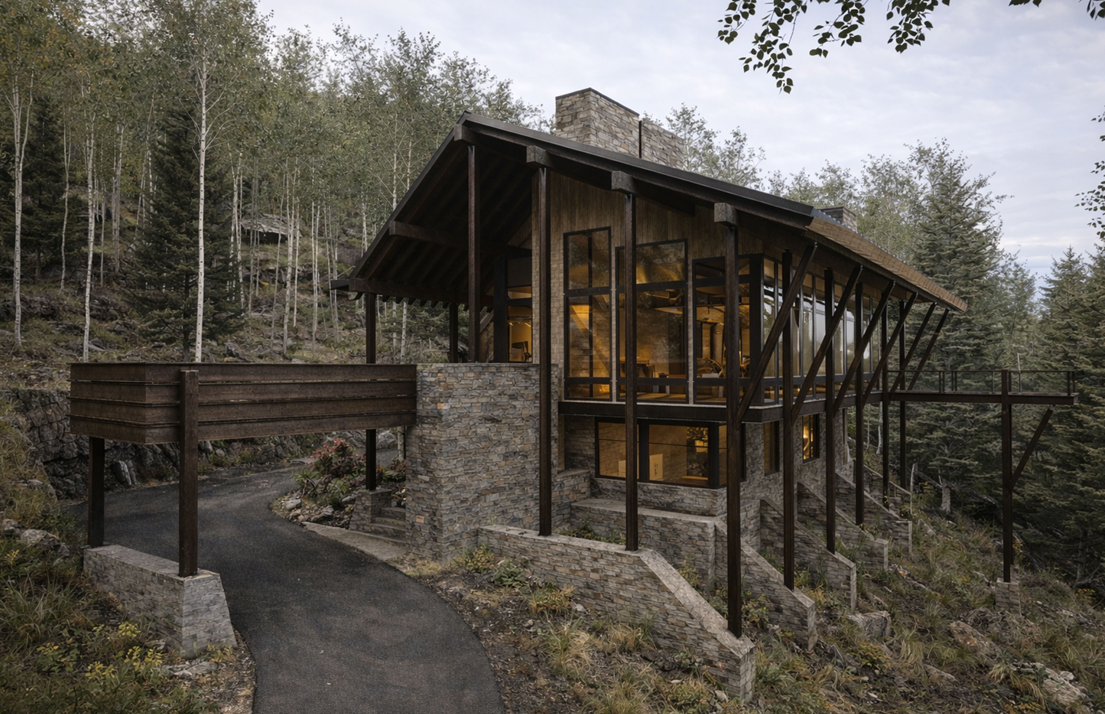 Carved into a steep, forested hillside above Mountain Village, Rock Skis is a home shaped by its rugged terrain and rare ski-in location. The site—narrow, densely wooded, and bordered by a spring-fed wetland—offered both challenge and opportunity. The design responds with a stepped composition anchored by a grounded stone base, rising upward into wood and glass volumes that open to filtered light and views through the trees. A lower-level garage and entry are tucked into the slope, while the main living spaces sit just above, unfolding toward the ridge.