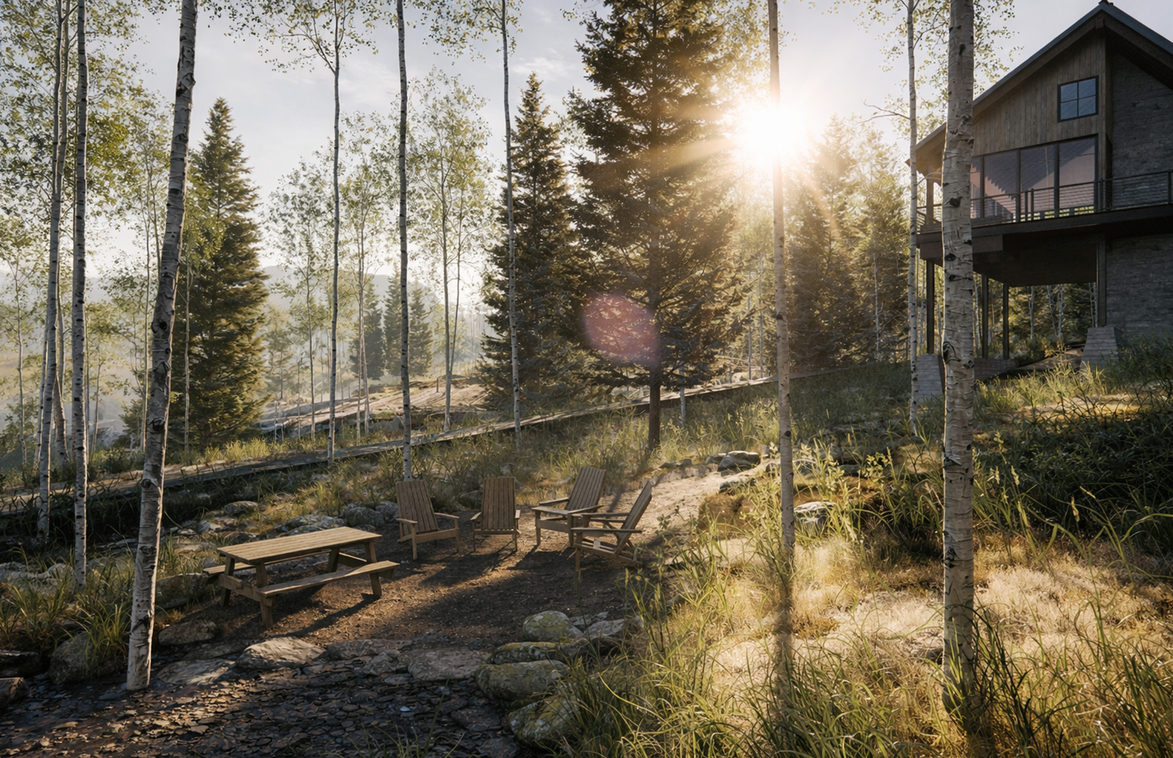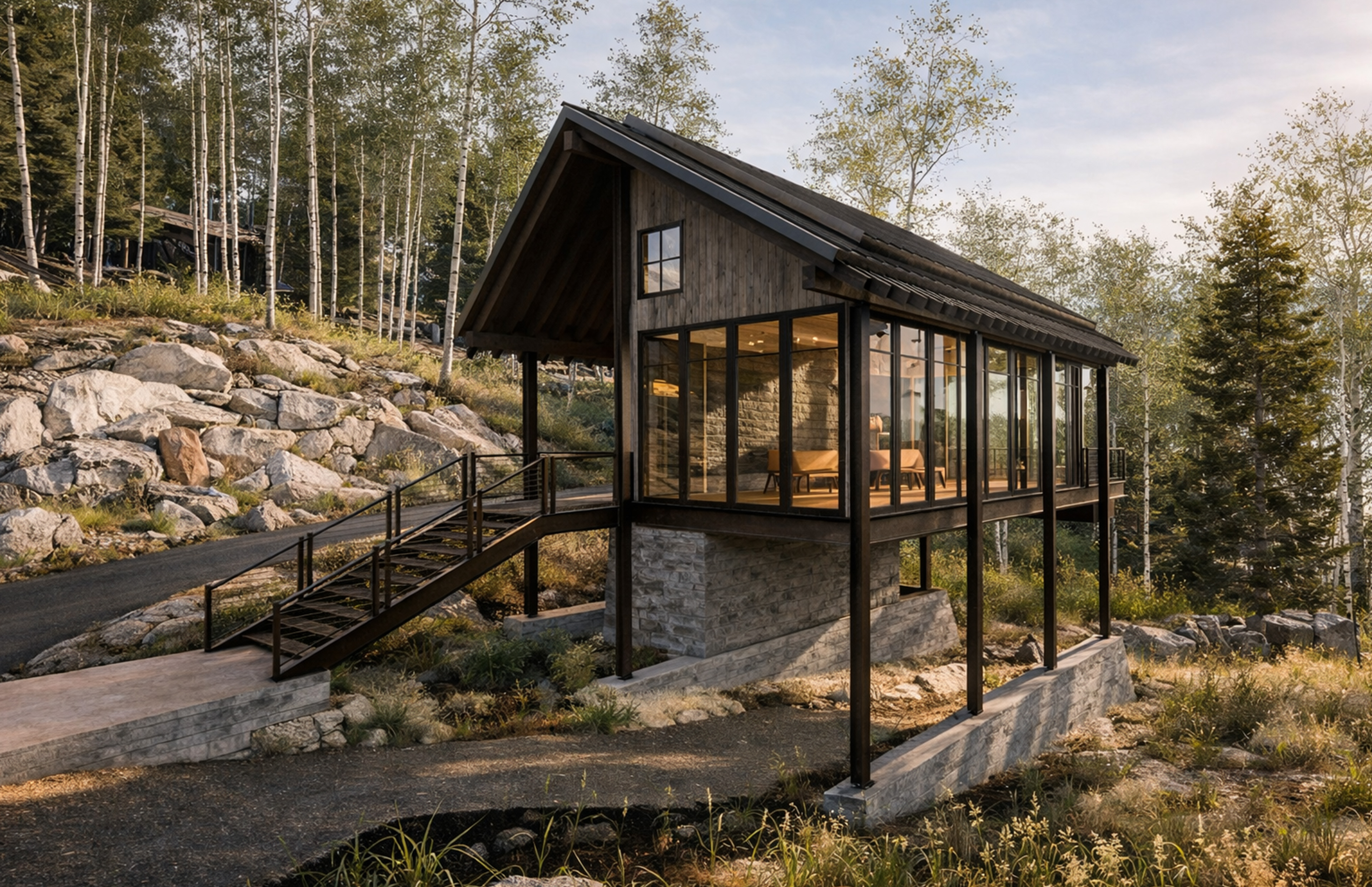At once secluded and connected, Rock Skis offers a layered mountain experience—where ski tracks lead to stone thresholds and forest views filter into every room.