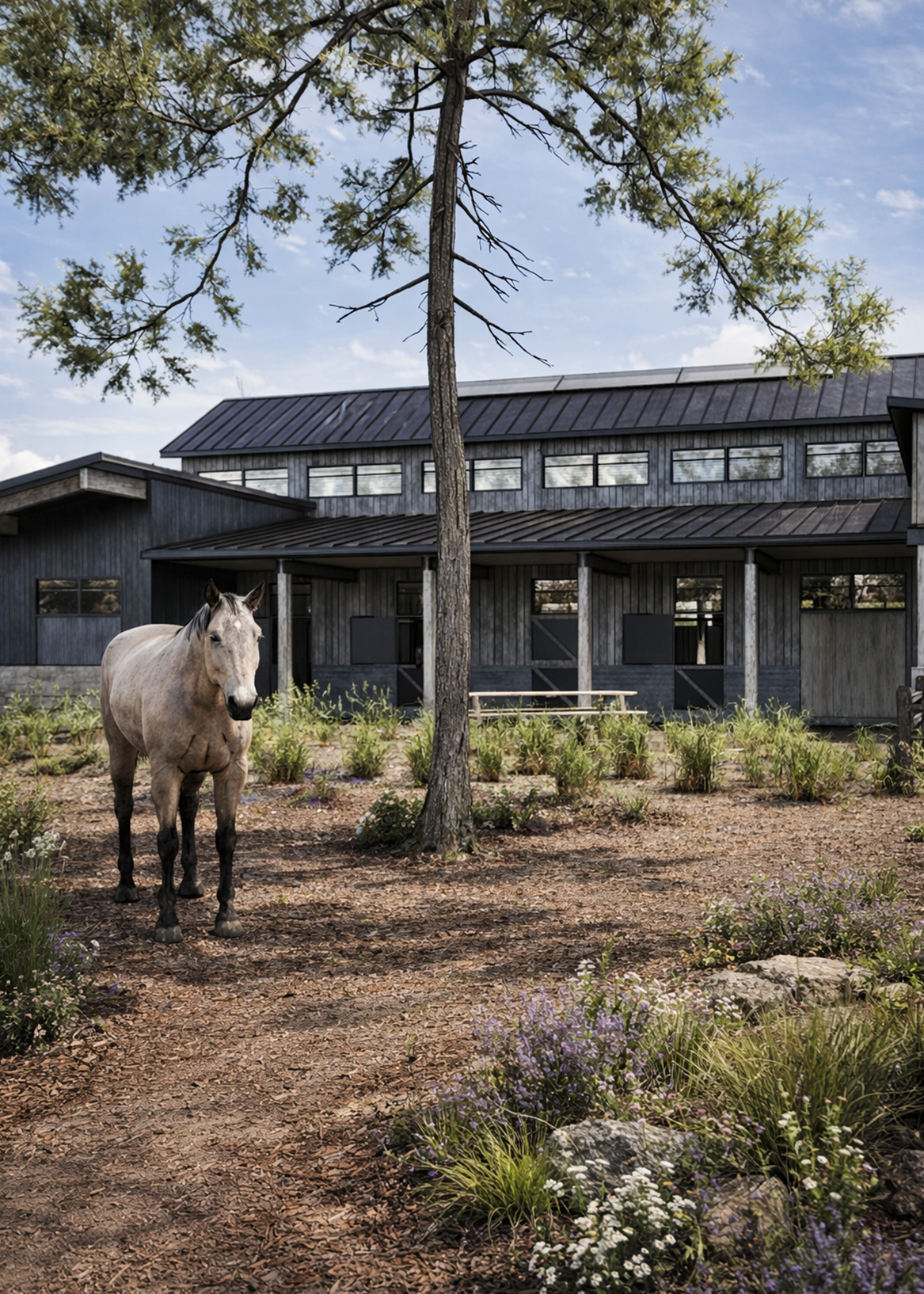 Specie Ranch sits atop Specie Mesa, where the landscape opens to sweeping vistas of the San Juan Mountains. Rooted in Colorado ranching traditions, the design draws from the vernacular of working ranch structures with simple forms, honest materials, and a direct relationship to the land. At its core, the project integrates a stable and residence into a cohesive whole, where function and dwelling are inseparable. Natural stone, weathered siding, and exposed steel connect the architecture to the rugged mesa, while large openings frame panoramic views and flood the interiors with light.