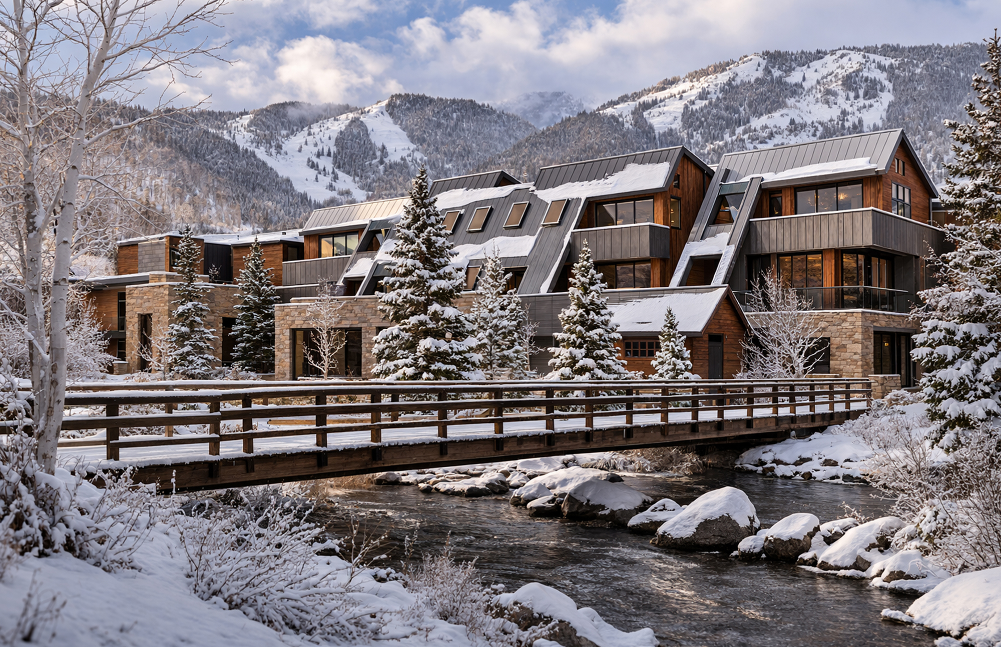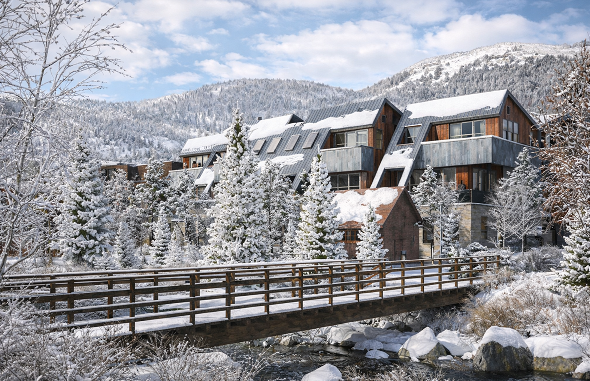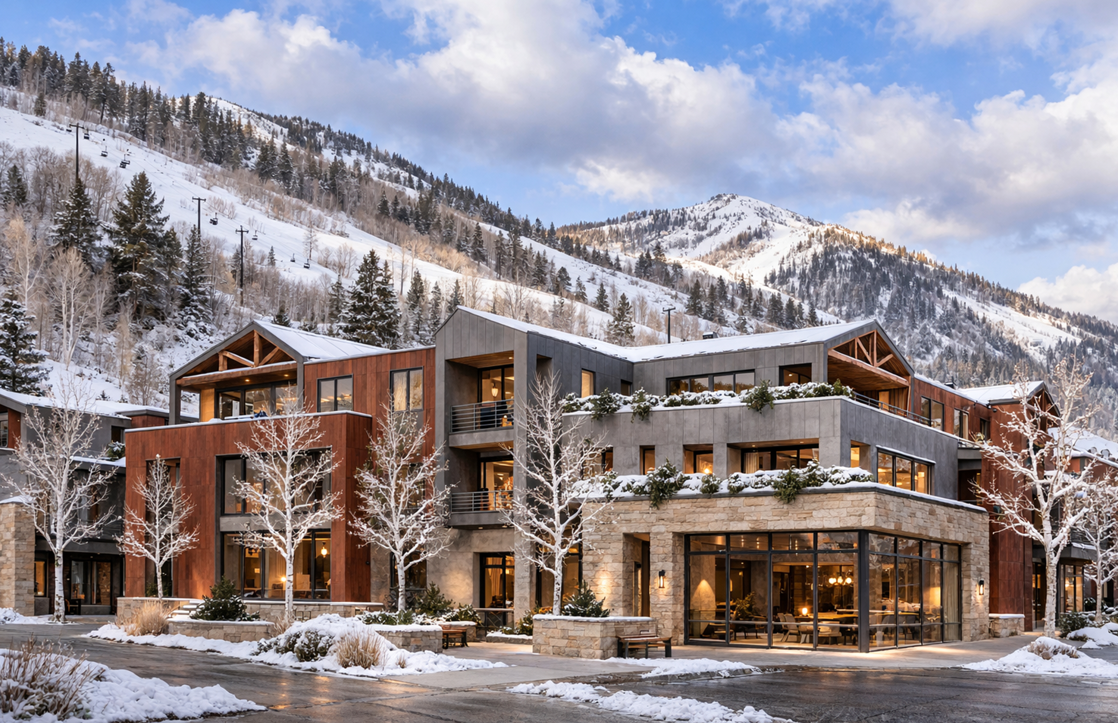 Set between the gondola and the river trail, TKV brings together living, gathering, and staying in a way that feels natural to Telluride’s rhythm. The buildings are arranged as a collection—each one distinct but connected—echoing the scale and spirit of the town’s historic warehouses. At the ground level, quiet commercial spaces open to the street, while upper levels hold a mix of homes and hotel rooms designed for both residents and travelers.