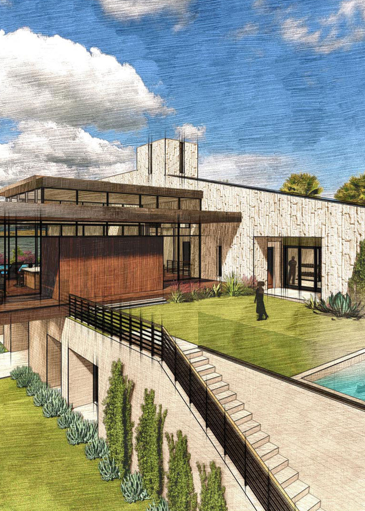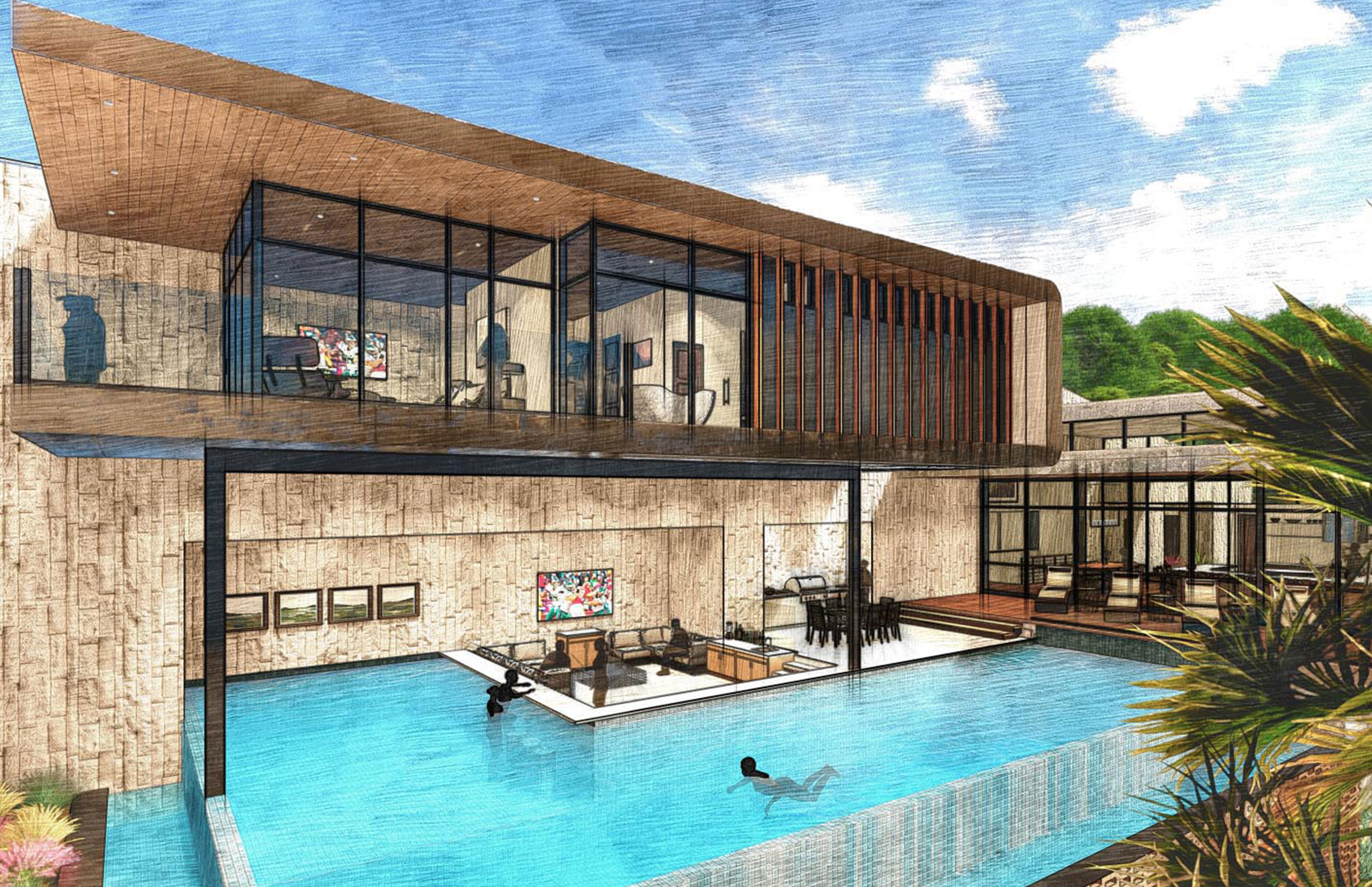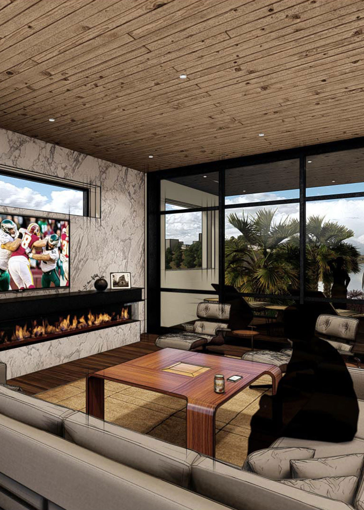 Perched above the tranquil shores outside Austin, this home embraces the natural contours, with living spaces that float above the bluff, offering uninterrupted views. An L-shaped pool wraps around a sunken lounge, blending indoor and outdoor living in a seamless embrace.Crafted from natural stone, warm wood, and metal accents, Epic Peninsula is anchored by a central stone form that rises from the earth — a tribute to the landscape that inspired it. This is architecture that lives and breathes with its surroundings.