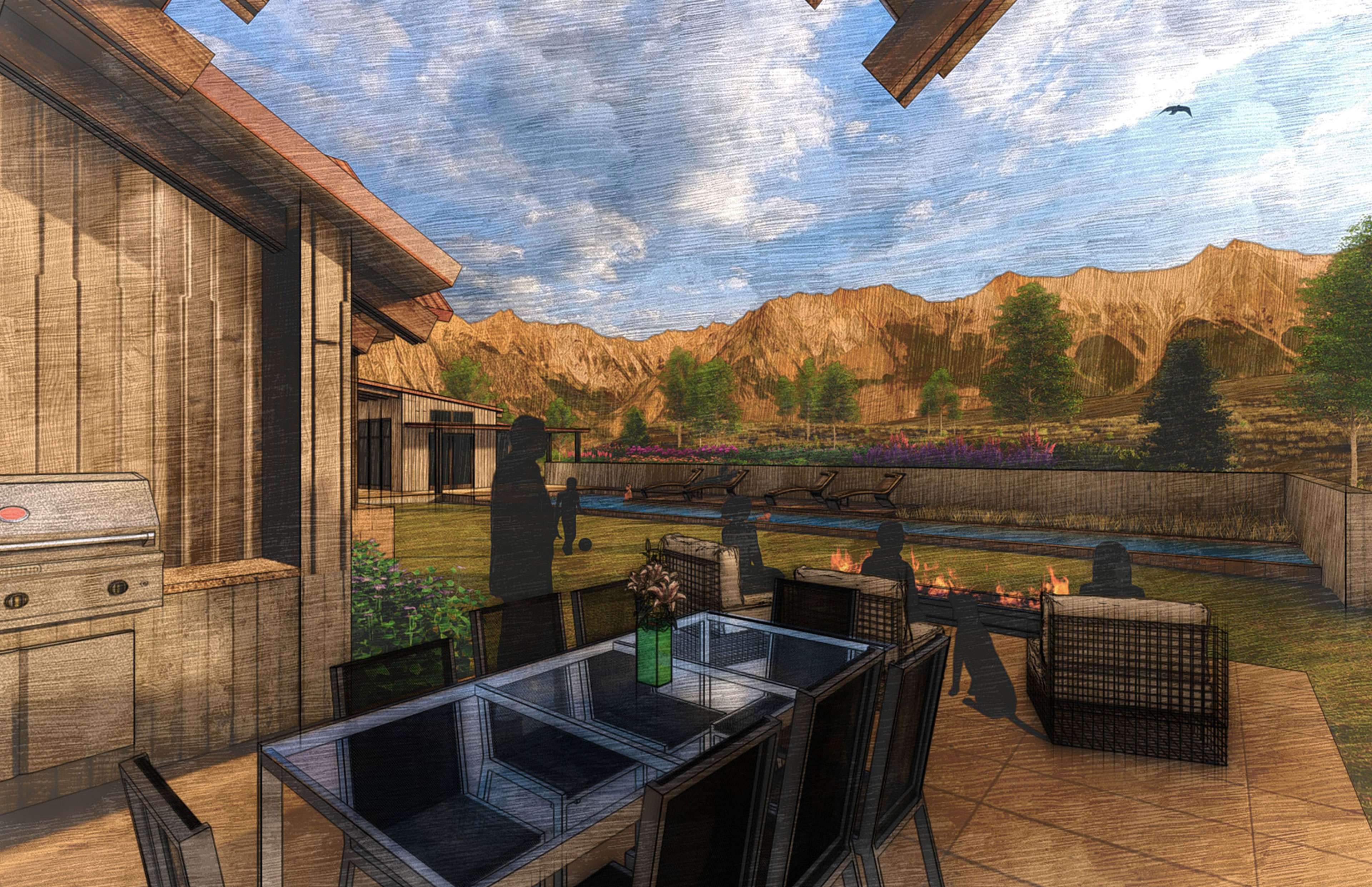 Across the site, outdoor spaces flow in every direction, oriented to sun, breeze, and mountain views. A round stone fire pit, inspired by ancestral Puebloan forms, anchors the entry and supports a floating bridge above. Meadow is an exploration of place, privacy, and perspective—designed to feel as if it has always belonged.