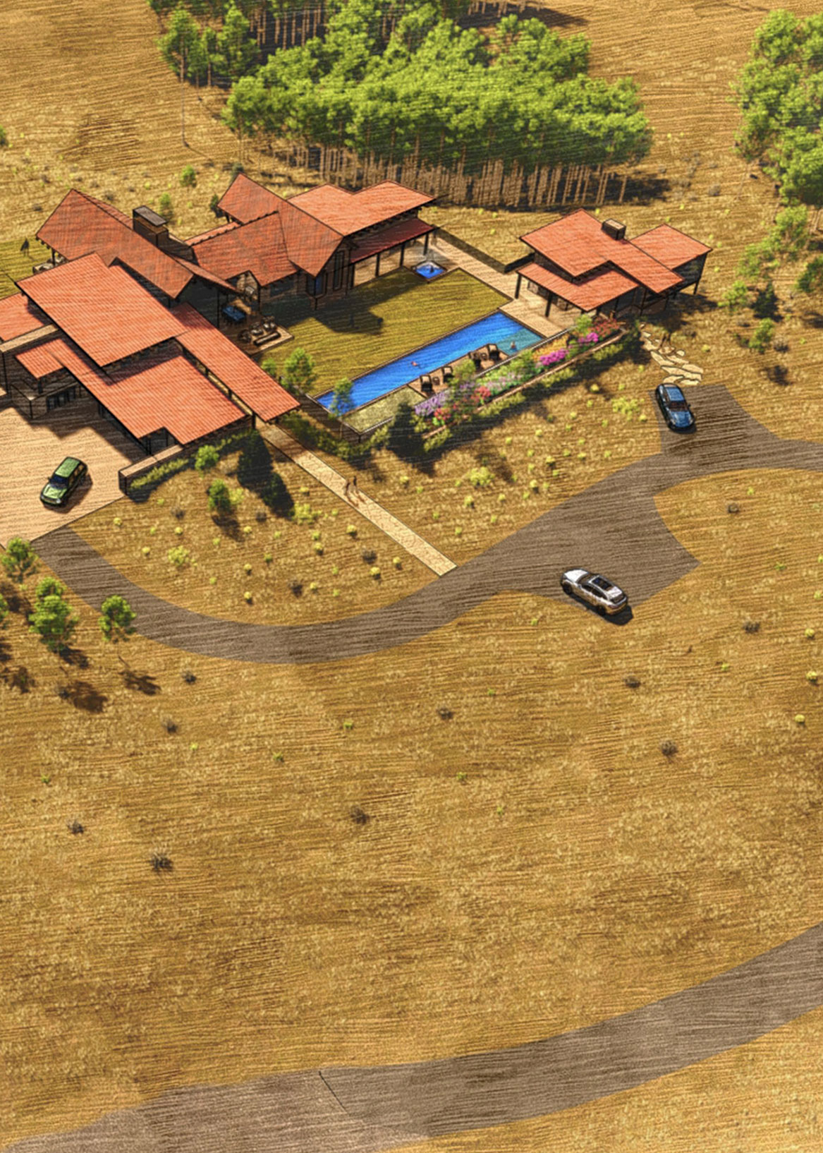 Set within a broad, open landscape framed by aspens and distant peaks, Meadow is a home shaped by sun, slope, and stillness. The design responds to the land’s natural contours—lifting living spaces toward panoramic views, while tucking the garage and drive discreetly into the terrain. Each volume is positioned with intention: a master suite nestled among trees with a treehouse-like feel, an office set above a glass bridge and waterfall, and a guest house beside a pond, shielded from the drive by an existing berm.