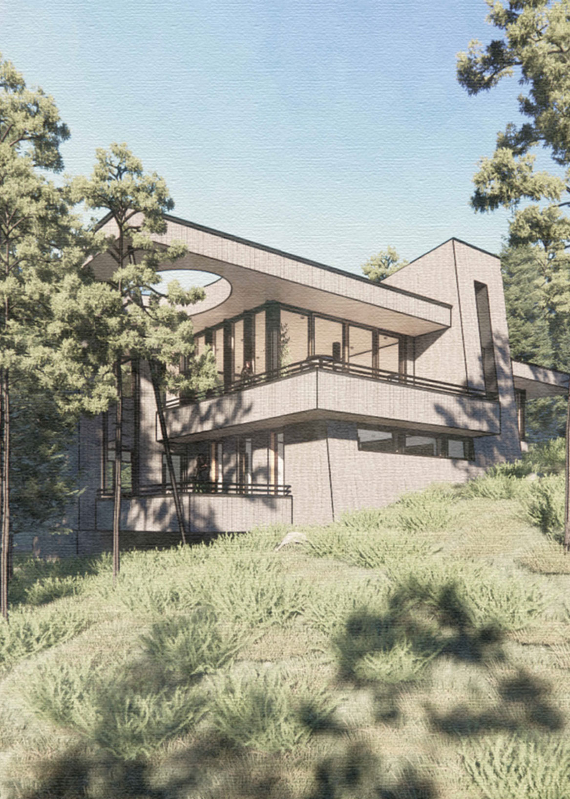 The form steps naturally with the slope, creating layered outdoor terraces and long view corridors through the trees.