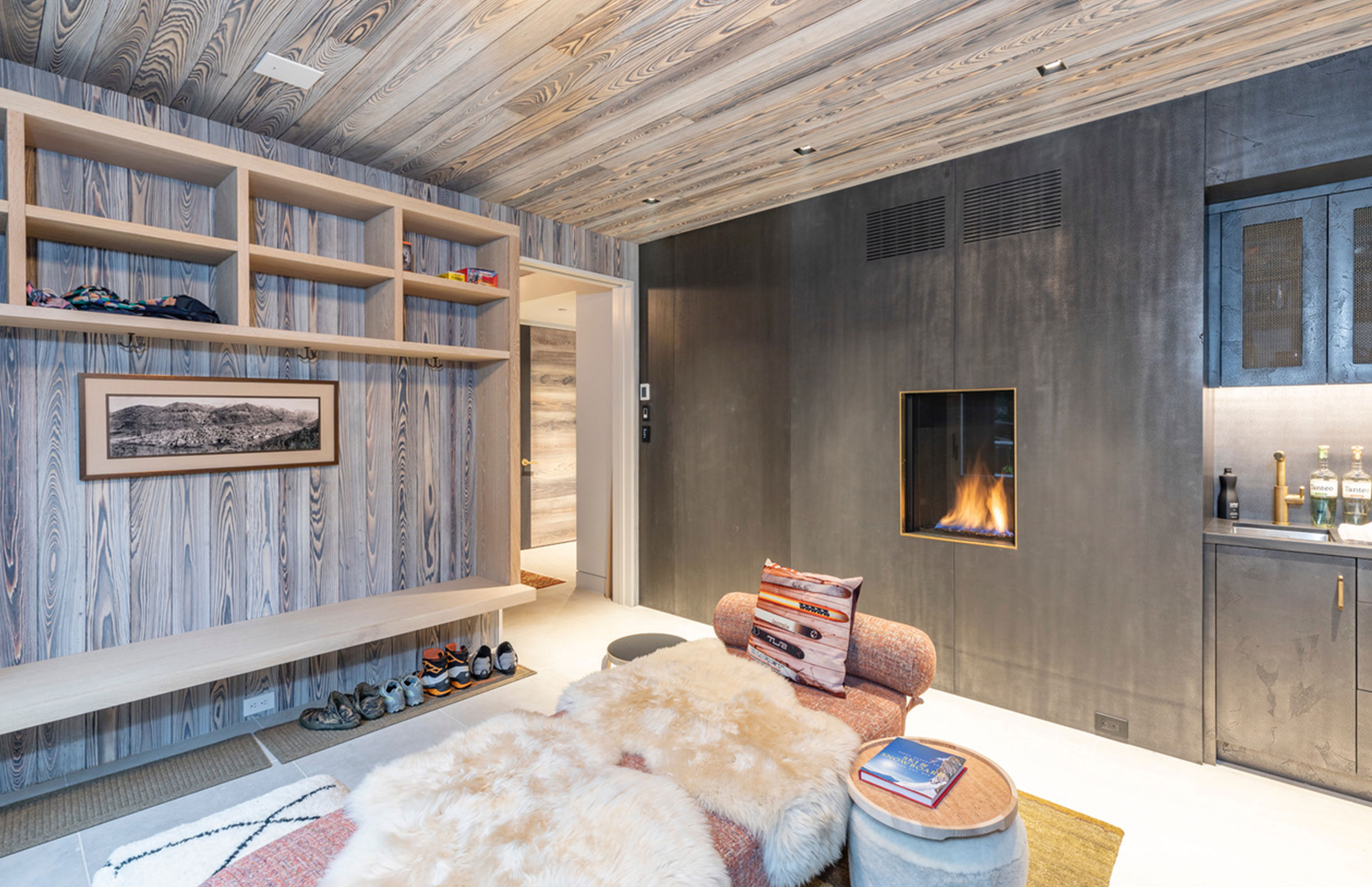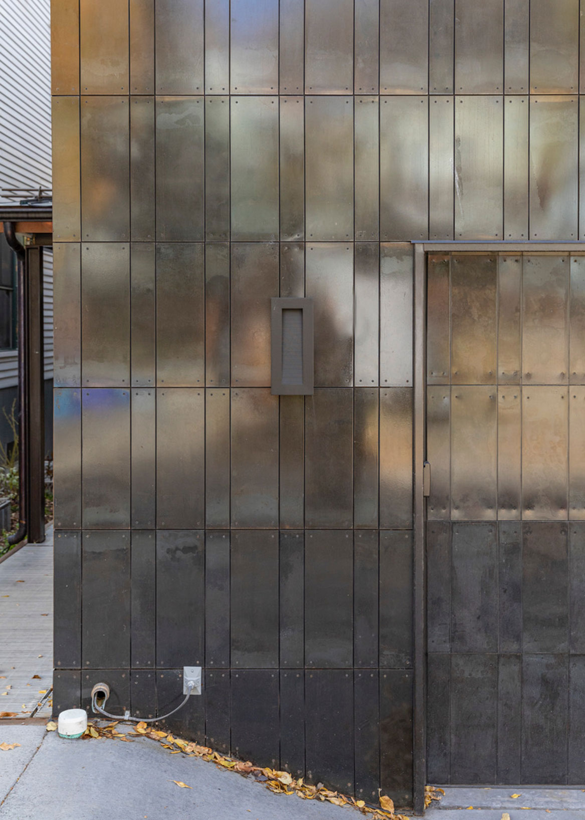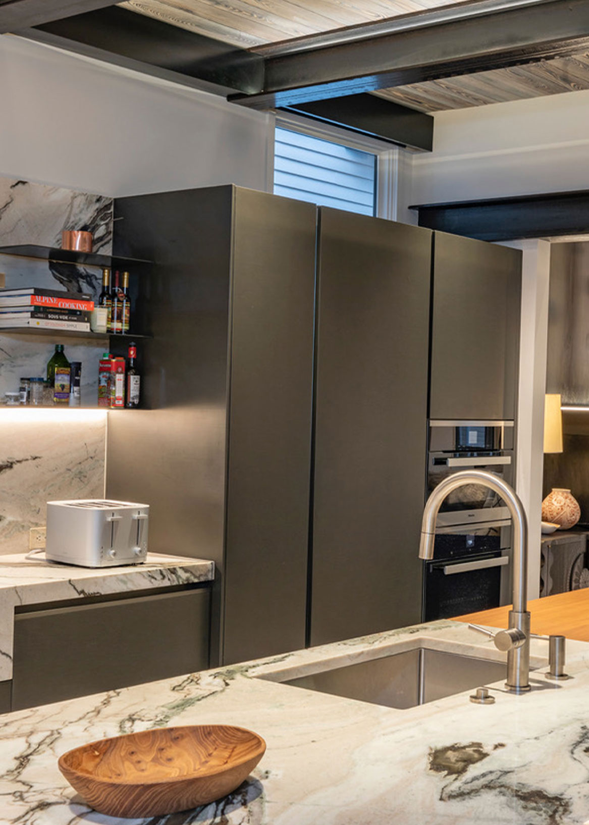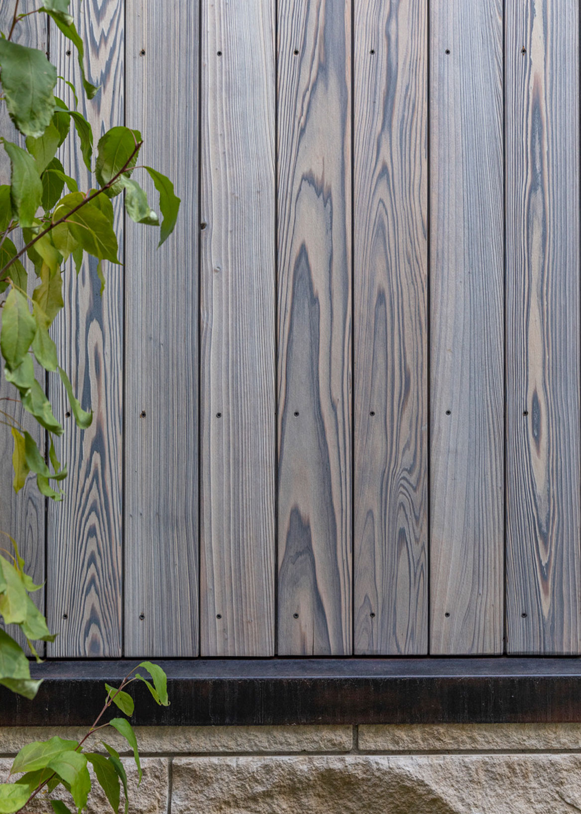 Materials—stone, vertical barnwood, charred siding, and patinated copper—were chosen to age with grace, echoing the language of both past and present.