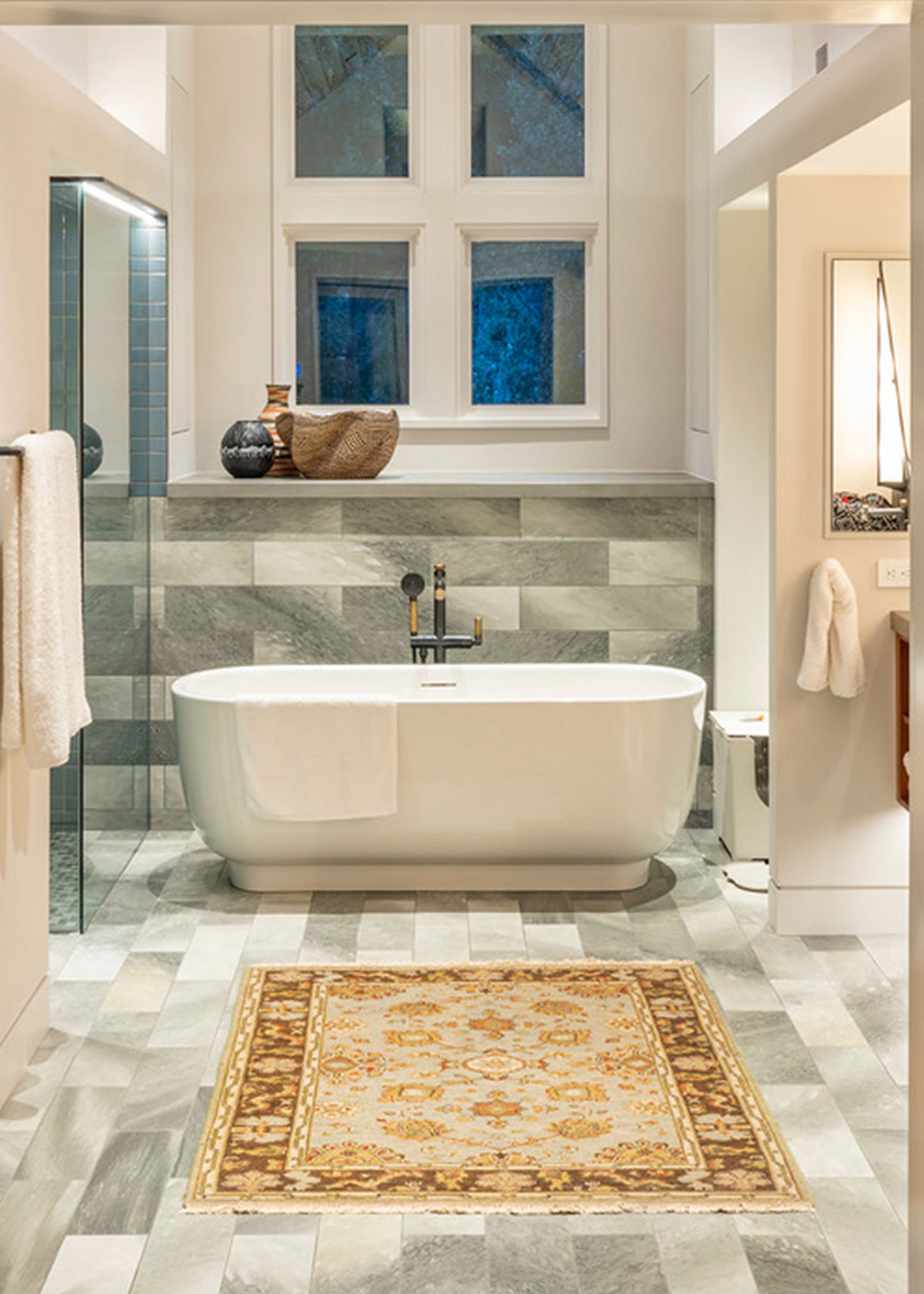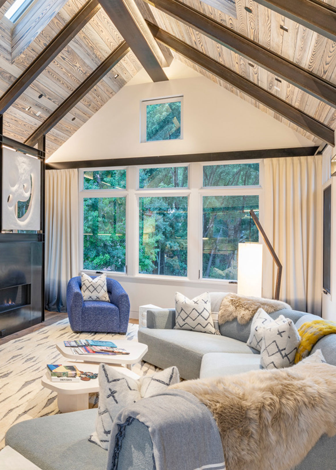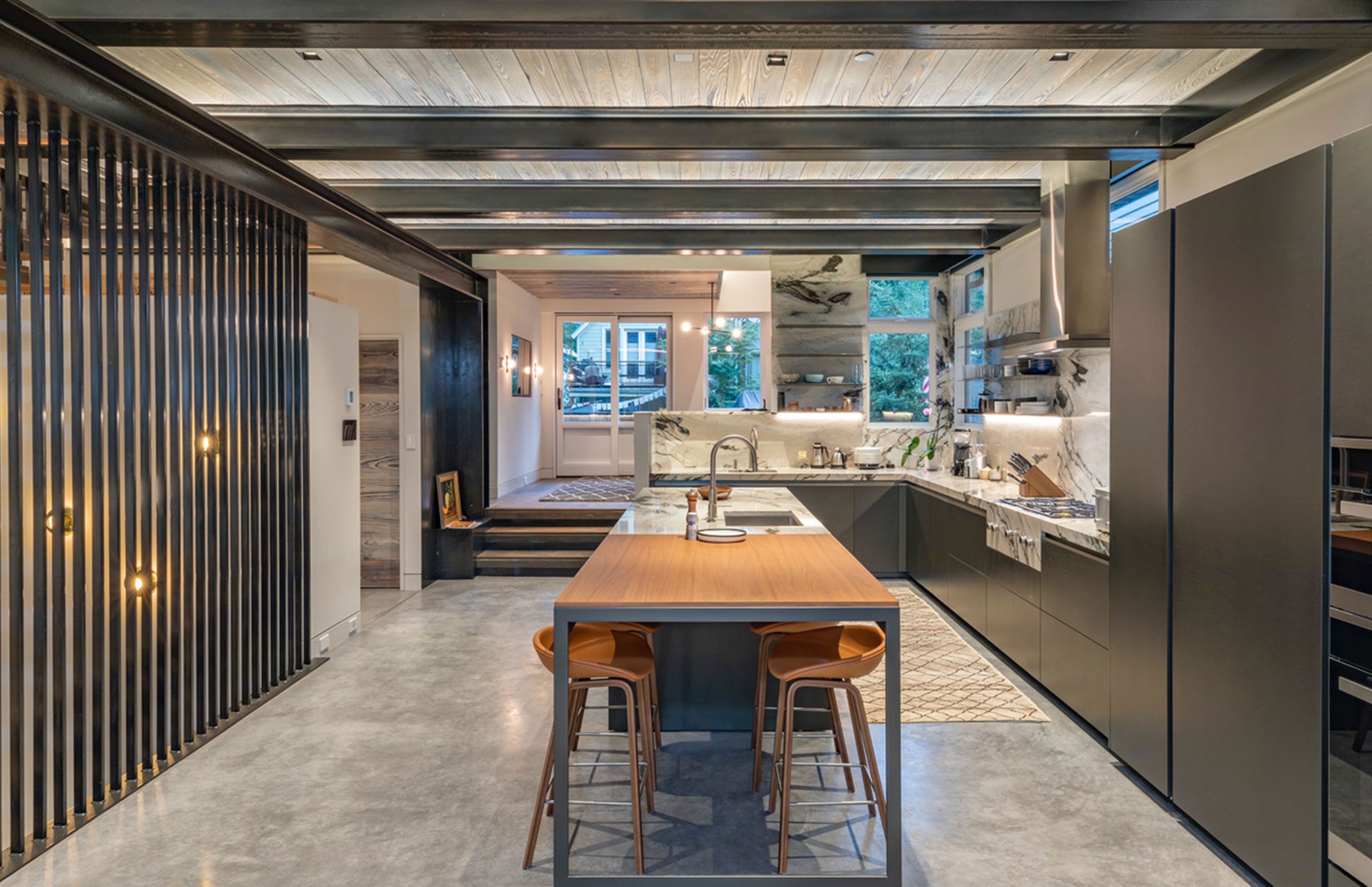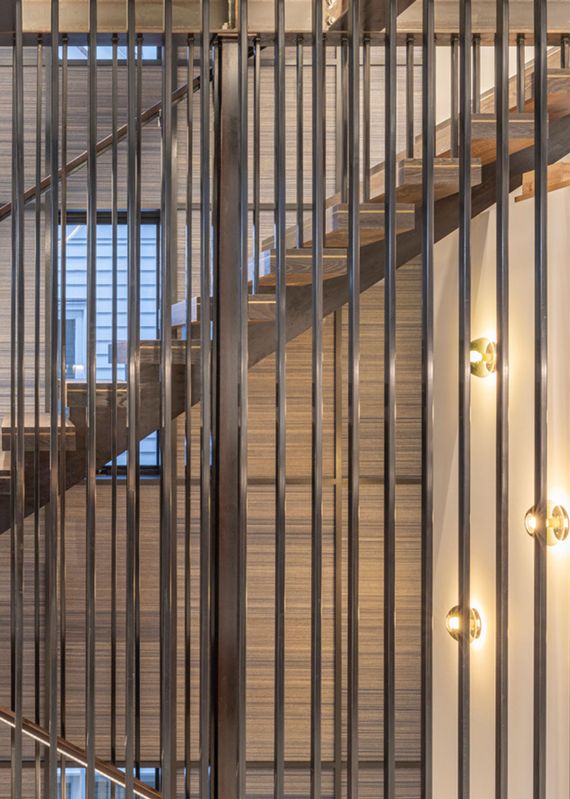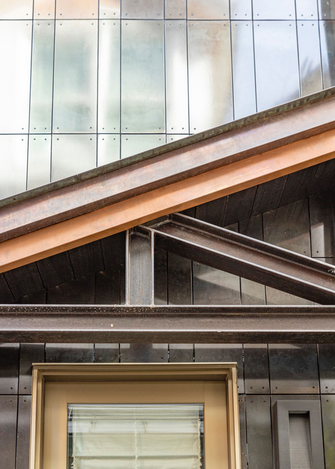 Materials—stone, vertical barnwood, charred siding, and patinated copper—were chosen to age with grace, echoing the language of both past and present.